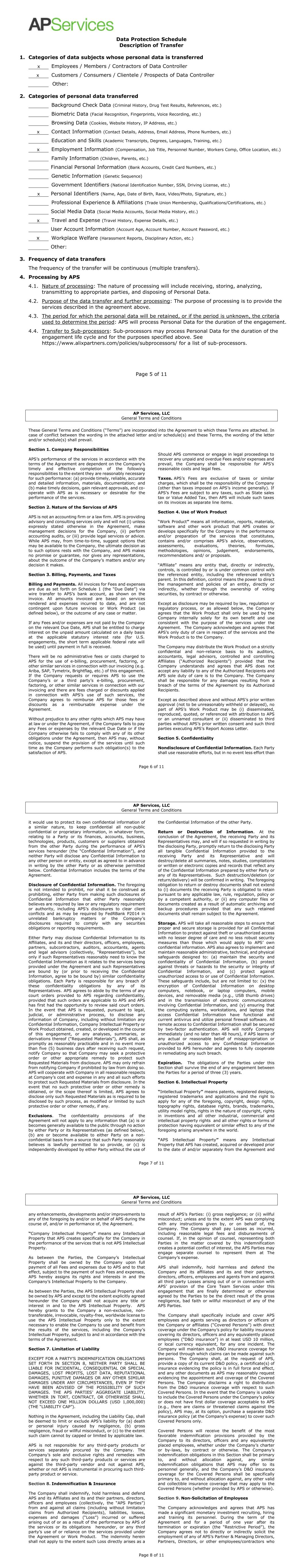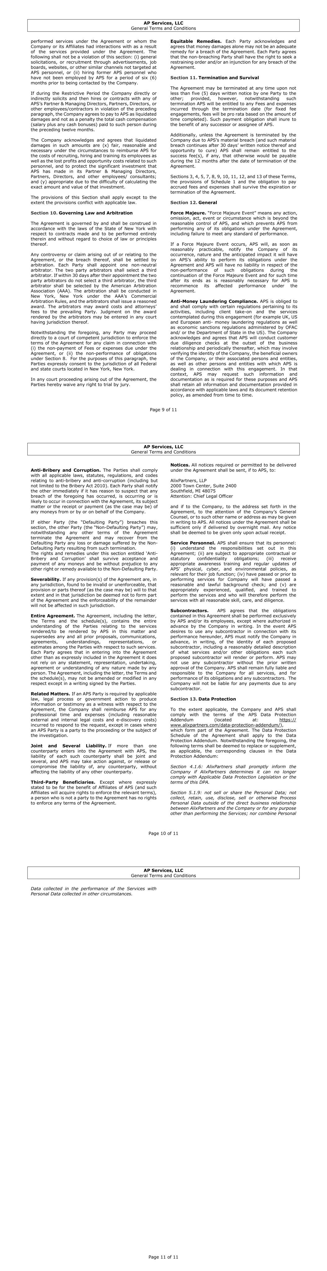 Page 5 of 11 Data Protection Schedule Description of Transfer 1. Categories of data subjects whose personal data is transferred x Employees / Members / Contractors of Data Controller x Customers / Consumers / Clientele / Prospects of Data Controller Other: 2. Categories of personal data transferred Background Check Data (Criminal History, Drug Test Results, References, etc.) Biometric Data (Facial Recognition, Fingerprints, Voice Recording, etc.) Browsing Data (Cookies, Website History, IP Address, etc.) x Contact Information (Contact Details, Address, Email Address, Phone Numbers, etc.) Education and Skills (Academic Transcripts, Degrees, Languages, Training, etc.) x Employment Information (Compensation, Job Title, Personnel Number, Workers Comp, Office Location, etc.) Family Information (Children, Parents, etc.) Financial Personal Information (Bank Accounts, Credit Card Numbers, etc.) Genetic Information (Genetic Sequence) Government Identifiers (National Identification Number, SSN, Driving License, etc.) x Personal Identifiers (Name, Age, Date of Birth, Race, Video/Photo, Signature, etc.) Professional Experience & Affiliations (Trade Union Membership, Qualifications/Certifications, etc.) Social Media Data (Social Media Accounts, Social Media History, etc.) x Travel and Expense (Travel History, Expense Details, etc.) User Account Information (Account Age, Account Number, Account Password, etc.) x Workplace Welfare (Harassment Reports, Disciplinary Action, etc.) Other: 3. Frequency of data transfers The frequency of the transfer will be continuous (multiple transfers). 4. Processing by APS 4.1. Nature of processing: The nature of processing will include receiving, storing, analyzing, transmitting to appropriate parties, and disposing of Personal Data. 4.2. Purpose of the data transfer and further processing: The purpose of processing is to provide the services described in the agreement above. 4.3. The period for which the personal data will be retained, or if the period is unknown, the criteria used to determine the period: APS will process Personal Data for the duration of the engagement. 4.4. Transfer to Sub-processors: Sub-processors may process Personal Data for the duration of the engagement life cycle and for the purposes specified above. See https://www.alixpartners.com/policies/subprocessors/ for a list of sub-processors. AP Services, LLC General Terms and Conditions Page 6 of 11 These General Terms and Conditions (“Terms”) are incorporated into the Agreement to which these Terms are attached. In case of conflict between the wording in the attached letter and/or schedule(s) and these Terms, the wording of the letter and/or schedule(s) shall prevail. Section 1. Company Responsibilities APS’s performance of the services in accordance with the terms of the Agreement are dependent on the Company’s timely and effective completion of the following responsibilities to the extent they are reasonably necessary for such performance: (a) provide timely, reliable, accurate and detailed information, materials, documentation; and (b) make timely decisions, gain relevant approvals, and co- operate with APS as is necessary or desirable for the performance of the services. Section 2. Nature of the Services of APS APS is not an accounting firm or a law firm. APS is providing advisory and consulting services only and will not (i) unless expressly stated otherwise in the Agreement, make management decisions for the Company, (ii) perform accounting audits, or (iii) provide legal services or advice. While APS may, from time-to-time, suggest options that may be available to the Company, the ultimate decision as to such options rests with the Company, and APS makes no promise or guarantee, nor gives any representations, about the outcome of the Company’s matters and/or any decision it makes. Section 3. Billing, Payments, and Taxes Billing and Payments. All invoices for Fees and expenses are due as set forth on Schedule 1 (the “Due Date”) via wire transfer to APS’s bank account, as shown on the invoice. All amounts invoiced are based on services rendered and expenses incurred to date, and are not contingent upon future services or Work Product (as defined below), or the outcome of any case or matter. If any Fees and/or expenses are not paid by the Company on the relevant Due Date, APS shall be entitled to charge interest on the unpaid amount calculated on a daily basis at the applicable statutory interest rate (for U.S. engagements, the short term applicable federal rate will be used) until payment in full is received. There will be no administrative fees or costs charged to APS for the use of e-billing, procurement, factoring, or other similar services in connection with our invoicing (e.g. Ariba, SAP, Tymetrix, Brightflag, etc.) of this engagement. If the Company requests or requires APS to use the Company’s or a third party’s e-billing, procurement, factoring, or other similar services in connection with our invoicing and there are fees charged or discounts applied in connection with APS’s use of such services, the Company agrees to reimburse APS for those fees or discounts as a reimbursable expense under the Agreement. Without prejudice to any other rights which APS may have at law or under the Agreement, if the Company fails to pay any Fees or expenses by the relevant Due Date or if the Company otherwise fails to comply with any of its other obligations under the Agreement, then APS may, without notice, suspend the provision of the services until such time as the Company performs such obligation(s) to the satisfaction of APS. Should APS commence or engage in legal proceedings to recover any unpaid and overdue Fees and/or expenses and prevail, the Company shall be responsible for APS’s reasonable costs and legal fees. Taxes. APS’s Fees are exclusive of taxes or similar charges, which shall be the responsibility of the Company (other than taxes imposed on APS’s income gen