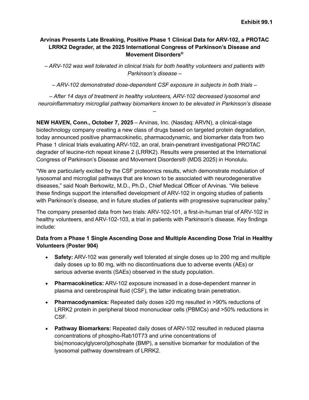 Exhibit 99.1 Arvinas Presents Late Breaking, Positive Phase 1 Clinical Data for ARV-102, a PROTAC LRRK2 Degrader, at the 2025 International Congress of Parkinson’s Disease and Movement Disorders® – ARV-102 was well tolerated in clinical trials for both healthy volunteers and patients with Parkinson’s disease – – ARV-102 demonstrated dose-dependent CSF exposure in subjects in both trials – – After 14 days of treatment in healthy volunteers, ARV-102 decreased lysosomal and neuroinflammatory microglial pathway biomarkers known to be elevated in Parkinson’s disease – NEW HAVEN, Conn., October 7, 2025 – Arvinas, Inc. (Nasdaq: ARVN), a clinical-stage biotechnology company creating a new class of drugs based on targeted protein degradation, today announced positive pharmacokinetic, pharmacodynamic, and biomarker data from two Phase 1 clinical trials evaluating ARV-102, an oral, brain-penetrant investigational PROTAC degrader of leucine-rich repeat kinase 2 (LRRK2). Results were presented at the International Congress of Parkinson’s Disease and Movement Disorders® (MDS 2025) in Honolulu. “We are particularly excited by the CSF proteomics results, which demonstrate modulation of lysosomal and microglial pathways that are known to be associated with neurodegenerative diseases,” said Noah Berkowitz, M.D., Ph.D., Chief Medical Officer of Arvinas. “We believe these findings support the intensified development of ARV-102 in ongoing studies of patients with Parkinson’s disease, and in future studies of patients with progressive supranuclear palsy.” The company presented data from two trials: ARV-102-101, a first-in-human trial of ARV-102 in healthy volunteers, and ARV-102-103, a trial in patients with Parkinson’s disease. Key findings include: Data from a Phase 1 Single Ascending Dose and Multiple Ascending Dose Trial in Healthy Volunteers (Poster 904) • Safety: ARV-102 was generally well tolerated at single doses up to 200 mg and multiple daily doses up to 80 mg, with no discontinuations due to adverse events (AEs) or serious adverse events (SAEs) observed in the study population. • Pharmacokinetics: ARV-102 exposure increased in a dose-dependent manner in plasma and cerebrospinal fluid (CSF), the latter indicating brain penetration. • Pharmacodynamics: Repeated daily doses ≥20 mg resulted in >90% reductions of LRRK2 protein in peripheral blood mononuclear cells (PBMCs) and >50% reductions in CSF. • Pathway Biomarkers: Repeated daily doses of ARV-102 resulted in reduced plasma concentrations of phospho-Rab10T73 and urine concentrations of bis(monoacylglycerol)phosphate (BMP), a sensitive biomarker for modulation of the lysosomal pathway downstream of LRRK2.