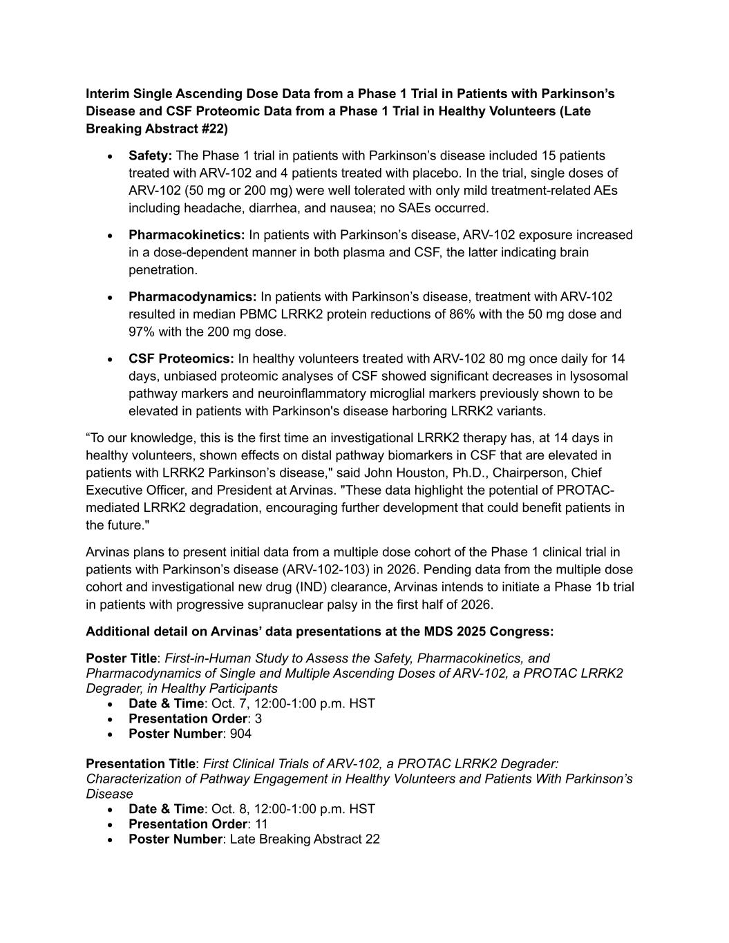 Interim Single Ascending Dose Data from a Phase 1 Trial in Patients with Parkinson’s Disease and CSF Proteomic Data from a Phase 1 Trial in Healthy Volunteers (Late Breaking Abstract #22) • Safety: The Phase 1 trial in patients with Parkinson’s disease included 15 patients treated with ARV-102 and 4 patients treated with placebo. In the trial, single doses of ARV-102 (50 mg or 200 mg) were well tolerated with only mild treatment-related AEs including headache, diarrhea, and nausea; no SAEs occurred. • Pharmacokinetics: In patients with Parkinson’s disease, ARV-102 exposure increased in a dose-dependent manner in both plasma and CSF, the latter indicating brain penetration. • Pharmacodynamics: In patients with Parkinson’s disease, treatment with ARV-102 resulted in median PBMC LRRK2 protein reductions of 86% with the 50 mg dose and 97% with the 200 mg dose. • CSF Proteomics: In healthy volunteers treated with ARV-102 80 mg once daily for 14 days, unbiased proteomic analyses of CSF showed significant decreases in lysosomal pathway markers and neuroinflammatory microglial markers previously shown to be elevated in patients with Parkinson's disease harboring LRRK2 variants. “To our knowledge, this is the first time an investigational LRRK2 therapy has, at 14 days in healthy volunteers, shown effects on distal pathway biomarkers in CSF that are elevated in patients with LRRK2 Parkinson’s disease," said John Houston, Ph.D., Chairperson, Chief Executive Officer, and President at Arvinas. "These data highlight the potential of PROTAC- mediated LRRK2 degradation, encouraging further development that could benefit patients in the future." Arvinas plans to present initial data from a multiple dose cohort of the Phase 1 clinical trial in patients with Parkinson’s disease (ARV-102-103) in 2026. Pending data from the multiple dose cohort and investigational new drug (IND) clearance, Arvinas intends to initiate a Phase 1b trial in patients with progressive supranuclear palsy in the first half of 2026. Additional detail on Arvinas’ data presentations at the MDS 2025 Congress: Poster Title: First-in-Human Study to Assess the Safety, Pharmacokinetics, and Pharmacodynamics of Single and Multiple Ascending Doses of ARV-102, a PROTAC LRRK2 Degrader, in Healthy Participants • Date & Time: Oct. 7, 12:00-1:00 p.m. HST • Presentation Order: 3 • Poster Number: 904 Presentation Title: First Clinical Trials of ARV-102, a PROTAC LRRK2 Degrader: Characterization of Pathway Engagement in Healthy Volunteers and Patients With Parkinson’s Disease • Date & Time: Oct. 8, 12:00-1:00 p.m. HST • Presentation Order: 11 • Poster Number: Late Breaking Abstract 22