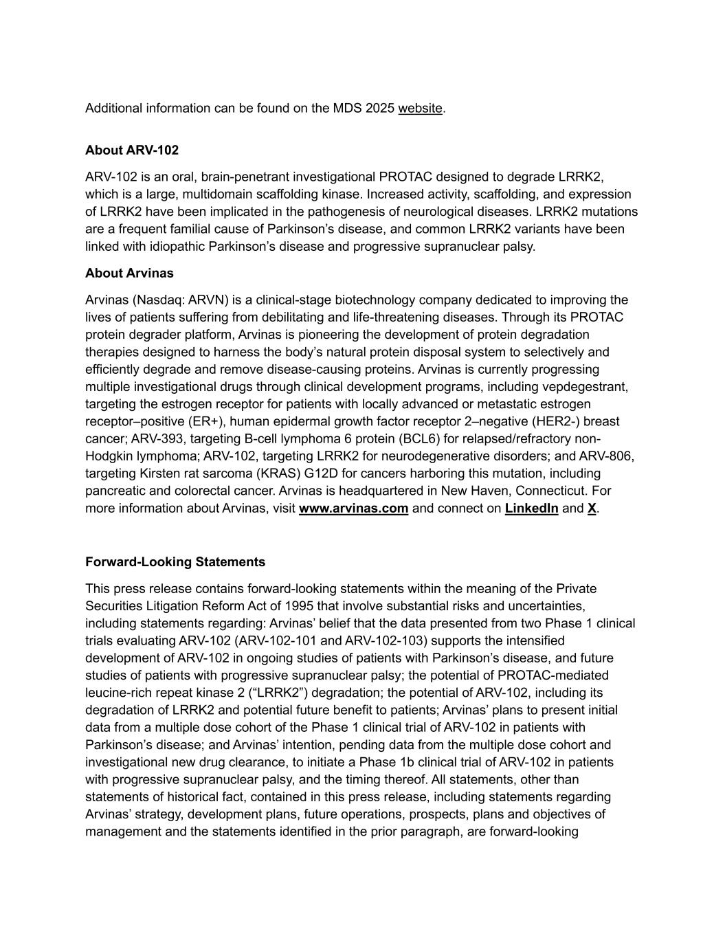 Additional information can be found on the MDS 2025 website. About ARV-102 ARV-102 is an oral, brain-penetrant investigational PROTAC designed to degrade LRRK2, which is a large, multidomain scaffolding kinase. Increased activity, scaffolding, and expression of LRRK2 have been implicated in the pathogenesis of neurological diseases. LRRK2 mutations are a frequent familial cause of Parkinson’s disease, and common LRRK2 variants have been linked with idiopathic Parkinson’s disease and progressive supranuclear palsy. About Arvinas Arvinas (Nasdaq: ARVN) is a clinical-stage biotechnology company dedicated to improving the lives of patients suffering from debilitating and life-threatening diseases. Through its PROTAC protein degrader platform, Arvinas is pioneering the development of protein degradation therapies designed to harness the body’s natural protein disposal system to selectively and efficiently degrade and remove disease-causing proteins. Arvinas is currently progressing multiple investigational drugs through clinical development programs, including vepdegestrant, targeting the estrogen receptor for patients with locally advanced or metastatic estrogen receptor–positive (ER+), human epidermal growth factor receptor 2–negative (HER2-) breast cancer; ARV-393, targeting B-cell lymphoma 6 protein (BCL6) for relapsed/refractory non- Hodgkin lymphoma; ARV-102, targeting LRRK2 for neurodegenerative disorders; and ARV-806, targeting Kirsten rat sarcoma (KRAS) G12D for cancers harboring this mutation, including pancreatic and colorectal cancer. Arvinas is headquartered in New Haven, Connecticut. For more information about Arvinas, visit www.arvinas.com and connect on LinkedIn and X. Forward-Looking Statements This press release contains forward-looking statements within the meaning of the Private Securities Litigation Reform Act of 1995 that involve substantial risks and uncertainties, including statements regarding: Arvinas’ belief that the data presented from two Phase 1 clinical trials evaluating ARV-102 (ARV-102-101 and ARV-102-103) supports the intensified development of ARV-102 in ongoing studies of patients with Parkinson’s disease, and future studies of patients with progressive supranuclear palsy; the potential of PROTAC-mediated leucine-rich repeat kinase 2 (“LRRK2”) degradation; the potential of ARV-102, including its degradation of LRRK2 and potential future benefit to patients; Arvinas’ plans to present initial data from a multiple dose cohort of the Phase 1 clinical trial of ARV-102 in patients with Parkinson’s disease; and Arvinas’ intention, pending data from the multiple dose cohort and investigational new drug clearance, to initiate a Phase 1b clinical trial of ARV-102 in patients with progressive supranuclear palsy, and the timing thereof. All statements, other than statements of historical fact, contained in this press release, including statements regarding Arvinas’ strategy, development plans, future operations, prospects, plans and objectives of management and the statements identified in the prior paragraph, are forward-looking