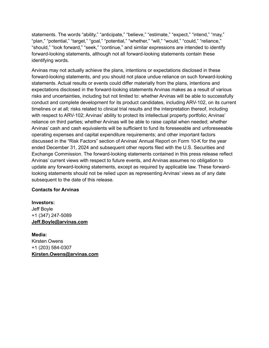 statements. The words “ability,” “anticipate,” “believe,” “estimate,” “expect,” “intend,” “may,” “plan,” “potential,” “target,” “goal,” “potential,” “whether,” “will,” “would,” “could,” “reliance,” “should,” “look forward,” “seek,” “continue,” and similar expressions are intended to identify forward-looking statements, although not all forward-looking statements contain these identifying words. Arvinas may not actually achieve the plans, intentions or expectations disclosed in these forward-looking statements, and you should not place undue reliance on such forward-looking statements. Actual results or events could differ materially from the plans, intentions and expectations disclosed in the forward-looking statements Arvinas makes as a result of various risks and uncertainties, including but not limited to: whether Arvinas will be able to successfully conduct and complete development for its product candidates, including ARV-102, on its current timelines or at all; risks related to clinical trial results and the interpretation thereof, including with respect to ARV-102; Arvinas’ ability to protect its intellectual property portfolio; Arvinas’ reliance on third parties; whether Arvinas will be able to raise capital when needed; whether Arvinas’ cash and cash equivalents will be sufficient to fund its foreseeable and unforeseeable operating expenses and capital expenditure requirements; and other important factors discussed in the “Risk Factors” section of Arvinas’ Annual Report on Form 10-K for the year ended December 31, 2024 and subsequent other reports filed with the U.S. Securities and Exchange Commission. The forward-looking statements contained in this press release reflect Arvinas’ current views with respect to future events, and Arvinas assumes no obligation to update any forward-looking statements, except as required by applicable law. These forward- looking statements should not be relied upon as representing Arvinas’ views as of any date subsequent to the date of this release. Contacts for Arvinas Investors: Jeff Boyle +1 (347) 247-5089 Jeff.Boyle@arvinas.com Media: Kirsten Owens +1 (203) 584-0307 Kirsten.Owens@arvinas.com
