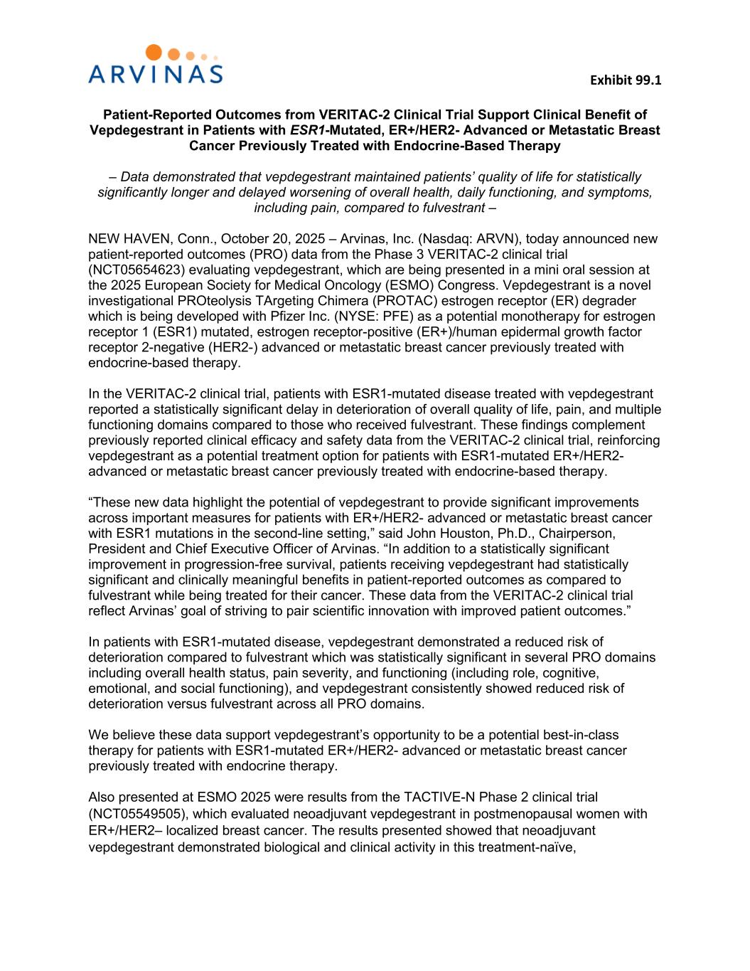 Exhibit 99.1 Patient-Reported Outcomes from VERITAC-2 Clinical Trial Support Clinical Benefit of Vepdegestrant in Patients with ESR1-Mutated, ER+/HER2- Advanced or Metastatic Breast Cancer Previously Treated with Endocrine-Based Therapy – Data demonstrated that vepdegestrant maintained patients’ quality of life for statistically significantly longer and delayed worsening of overall health, daily functioning, and symptoms, including pain, compared to fulvestrant – NEW HAVEN, Conn., October 20, 2025 – Arvinas, Inc. (Nasdaq: ARVN), today announced new patient-reported outcomes (PRO) data from the Phase 3 VERITAC-2 clinical trial (NCT05654623) evaluating vepdegestrant, which are being presented in a mini oral session at the 2025 European Society for Medical Oncology (ESMO) Congress. Vepdegestrant is a novel investigational PROteolysis TArgeting Chimera (PROTAC) estrogen receptor (ER) degrader which is being developed with Pfizer Inc. (NYSE: PFE) as a potential monotherapy for estrogen receptor 1 (ESR1) mutated, estrogen receptor-positive (ER+)/human epidermal growth factor receptor 2-negative (HER2-) advanced or metastatic breast cancer previously treated with endocrine-based therapy. In the VERITAC-2 clinical trial, patients with ESR1-mutated disease treated with vepdegestrant reported a statistically significant delay in deterioration of overall quality of life, pain, and multiple functioning domains compared to those who received fulvestrant. These findings complement previously reported clinical efficacy and safety data from the VERITAC-2 clinical trial, reinforcing vepdegestrant as a potential treatment option for patients with ESR1-mutated ER+/HER2- advanced or metastatic breast cancer previously treated with endocrine-based therapy. “These new data highlight the potential of vepdegestrant to provide significant improvements across important measures for patients with ER+/HER2- advanced or metastatic breast cancer with ESR1 mutations in the second-line setting,” said John Houston, Ph.D., Chairperson, President and Chief Executive Officer of Arvinas. “In addition to a statistically significant improvement in progression-free survival, patients receiving vepdegestrant had statistically significant and clinically meaningful benefits in patient-reported outcomes as compared to fulvestrant while being treated for their cancer. These data from the VERITAC-2 clinical trial reflect Arvinas’ goal of striving to pair scientific innovation with improved patient outcomes.” In patients with ESR1-mutated disease, vepdegestrant demonstrated a reduced risk of deterioration compared to fulvestrant which was statistically significant in several PRO domains including overall health status, pain severity, and functioning (including role, cognitive, emotional, and social functioning), and vepdegestrant consistently showed reduced risk of deterioration versus fulvestrant across all PRO domains. We believe these data support vepdegestrant’s opportunity to be a potential best-in-class therapy for patients with ESR1-mutated ER+/HER2- advanced or metastatic breast cancer previously treated with endocrine therapy. Also presented at ESMO 2025 were results from the TACTIVE-N Phase 2 clinical trial (NCT05549505), which evaluated neoadjuvant vepdegestrant in postmenopausal women with ER+/HER2– localized breast cancer. The results presented showed that neoadjuvant vepdegestrant demonstrated biological and clinical activity in this treatment-naïve,