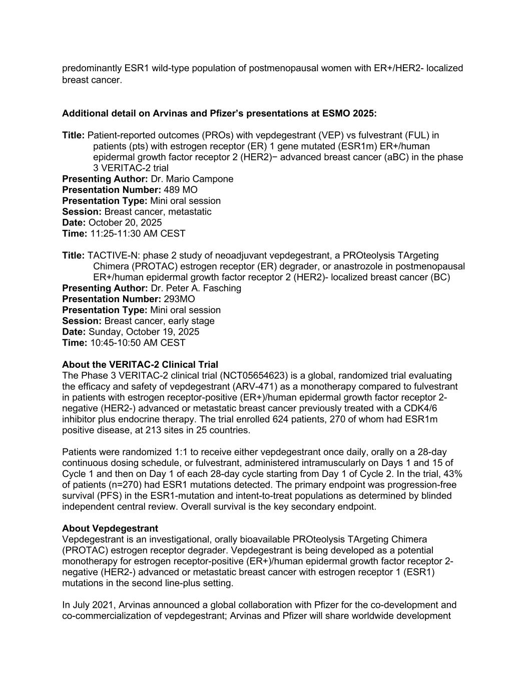 predominantly ESR1 wild-type population of postmenopausal women with ER+/HER2- localized breast cancer. Additional detail on Arvinas and Pfizer’s presentations at ESMO 2025: Title: Patient-reported outcomes (PROs) with vepdegestrant (VEP) vs fulvestrant (FUL) in patients (pts) with estrogen receptor (ER) 1 gene mutated (ESR1m) ER+/human epidermal growth factor receptor 2 (HER2)− advanced breast cancer (aBC) in the phase 3 VERITAC-2 trial Presenting Author: Dr. Mario Campone Presentation Number: 489 MO Presentation Type: Mini oral session Session: Breast cancer, metastatic Date: October 20, 2025 Time: 11:25-11:30 AM CEST Title: TACTIVE-N: phase 2 study of neoadjuvant vepdegestrant, a PROteolysis TArgeting Chimera (PROTAC) estrogen receptor (ER) degrader, or anastrozole in postmenopausal ER+/human epidermal growth factor receptor 2 (HER2)- localized breast cancer (BC) Presenting Author: Dr. Peter A. Fasching Presentation Number: 293MO Presentation Type: Mini oral session Session: Breast cancer, early stage Date: Sunday, October 19, 2025 Time: 10:45-10:50 AM CEST About the VERITAC-2 Clinical Trial The Phase 3 VERITAC-2 clinical trial (NCT05654623) is a global, randomized trial evaluating the efficacy and safety of vepdegestrant (ARV-471) as a monotherapy compared to fulvestrant in patients with estrogen receptor-positive (ER+)/human epidermal growth factor receptor 2- negative (HER2-) advanced or metastatic breast cancer previously treated with a CDK4/6 inhibitor plus endocrine therapy. The trial enrolled 624 patients, 270 of whom had ESR1m positive disease, at 213 sites in 25 countries. Patients were randomized 1:1 to receive either vepdegestrant once daily, orally on a 28-day continuous dosing schedule, or fulvestrant, administered intramuscularly on Days 1 and 15 of Cycle 1 and then on Day 1 of each 28-day cycle starting from Day 1 of Cycle 2. In the trial, 43% of patients (n=270) had ESR1 mutations detected. The primary endpoint was progression-free survival (PFS) in the ESR1-mutation and intent-to-treat populations as determined by blinded independent central review. Overall survival is the key secondary endpoint. About Vepdegestrant Vepdegestrant is an investigational, orally bioavailable PROteolysis TArgeting Chimera (PROTAC) estrogen receptor degrader. Vepdegestrant is being developed as a potential monotherapy for estrogen receptor-positive (ER+)/human epidermal growth factor receptor 2- negative (HER2-) advanced or metastatic breast cancer with estrogen receptor 1 (ESR1) mutations in the second line-plus setting. In July 2021, Arvinas announced a global collaboration with Pfizer for the co-development and co-commercialization of vepdegestrant; Arvinas and Pfizer will share worldwide development