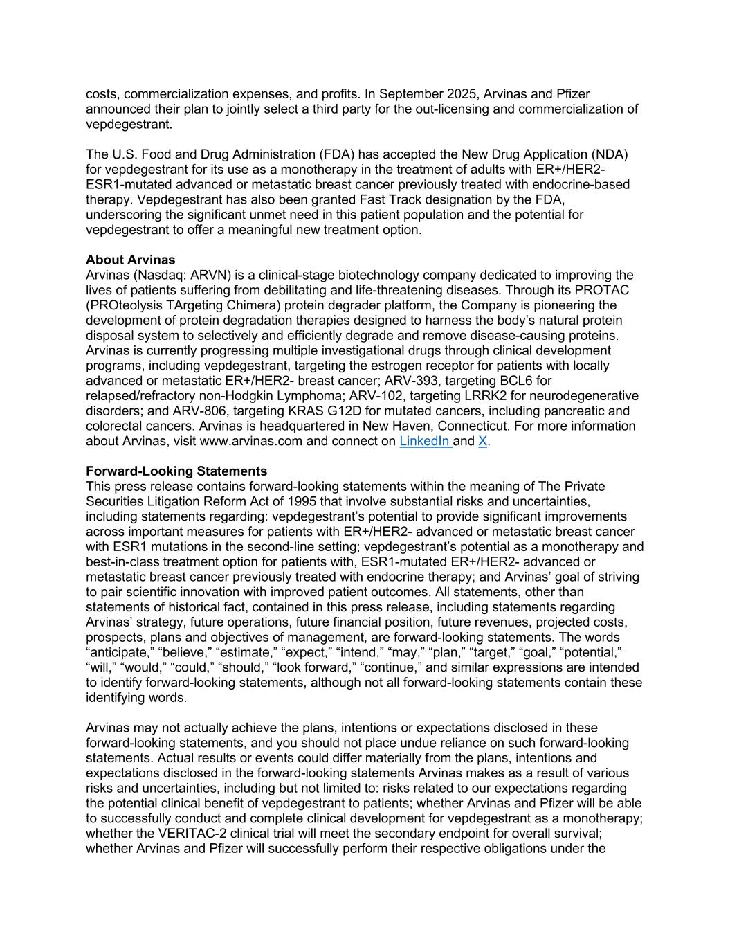 costs, commercialization expenses, and profits. In September 2025, Arvinas and Pfizer announced their plan to jointly select a third party for the out-licensing and commercialization of vepdegestrant. The U.S. Food and Drug Administration (FDA) has accepted the New Drug Application (NDA) for vepdegestrant for its use as a monotherapy in the treatment of adults with ER+/HER2- ESR1-mutated advanced or metastatic breast cancer previously treated with endocrine-based therapy. Vepdegestrant has also been granted Fast Track designation by the FDA, underscoring the significant unmet need in this patient population and the potential for vepdegestrant to offer a meaningful new treatment option. About Arvinas Arvinas (Nasdaq: ARVN) is a clinical-stage biotechnology company dedicated to improving the lives of patients suffering from debilitating and life-threatening diseases. Through its PROTAC (PROteolysis TArgeting Chimera) protein degrader platform, the Company is pioneering the development of protein degradation therapies designed to harness the body’s natural protein disposal system to selectively and efficiently degrade and remove disease-causing proteins. Arvinas is currently progressing multiple investigational drugs through clinical development programs, including vepdegestrant, targeting the estrogen receptor for patients with locally advanced or metastatic ER+/HER2- breast cancer; ARV-393, targeting BCL6 for relapsed/refractory non-Hodgkin Lymphoma; ARV-102, targeting LRRK2 for neurodegenerative disorders; and ARV-806, targeting KRAS G12D for mutated cancers, including pancreatic and colorectal cancers. Arvinas is headquartered in New Haven, Connecticut. For more information about Arvinas, visit www.arvinas.com and connect on LinkedIn and X. Forward-Looking Statements This press release contains forward-looking statements within the meaning of The Private Securities Litigation Reform Act of 1995 that involve substantial risks and uncertainties, including statements regarding: vepdegestrant’s potential to provide significant improvements across important measures for patients with ER+/HER2- advanced or metastatic breast cancer with ESR1 mutations in the second-line setting; vepdegestrant’s potential as a monotherapy and best-in-class treatment option for patients with, ESR1-mutated ER+/HER2- advanced or metastatic breast cancer previously treated with endocrine therapy; and Arvinas’ goal of striving to pair scientific innovation with improved patient outcomes. All statements, other than statements of historical fact, contained in this press release, including statements regarding Arvinas’ strategy, future operations, future financial position, future revenues, projected costs, prospects, plans and objectives of management, are forward-looking statements. The words “anticipate,” “believe,” “estimate,” “expect,” “intend,” “may,” “plan,” “target,” “goal,” “potential,” “will,” “would,” “could,” “should,” “look forward,” “continue,” and similar expressions are intended to identify forward-looking statements, although not all forward-looking statements contain these identifying words. Arvinas may not actually achieve the plans, intentions or expectations disclosed in these forward-looking statements, and you should not place undue reliance on such forward-looking statements. Actual results or events could differ materially from the plans, intentions and expectations disclosed in the forward-looking statements Arvinas makes as a result of various risks and uncertainties, including but not limited to: risks related to our expectations regarding the potential clinical benefit of vepdegestrant to patients; whether Arvinas and Pfizer will be able to successfully conduct and complete clinical development for vepdegestrant as a monotherapy; whether the VERITAC-2 clinical trial will meet the secondary endpoint for overall survival; whether Arvinas and Pfizer will successfully perform their respective obligations under the