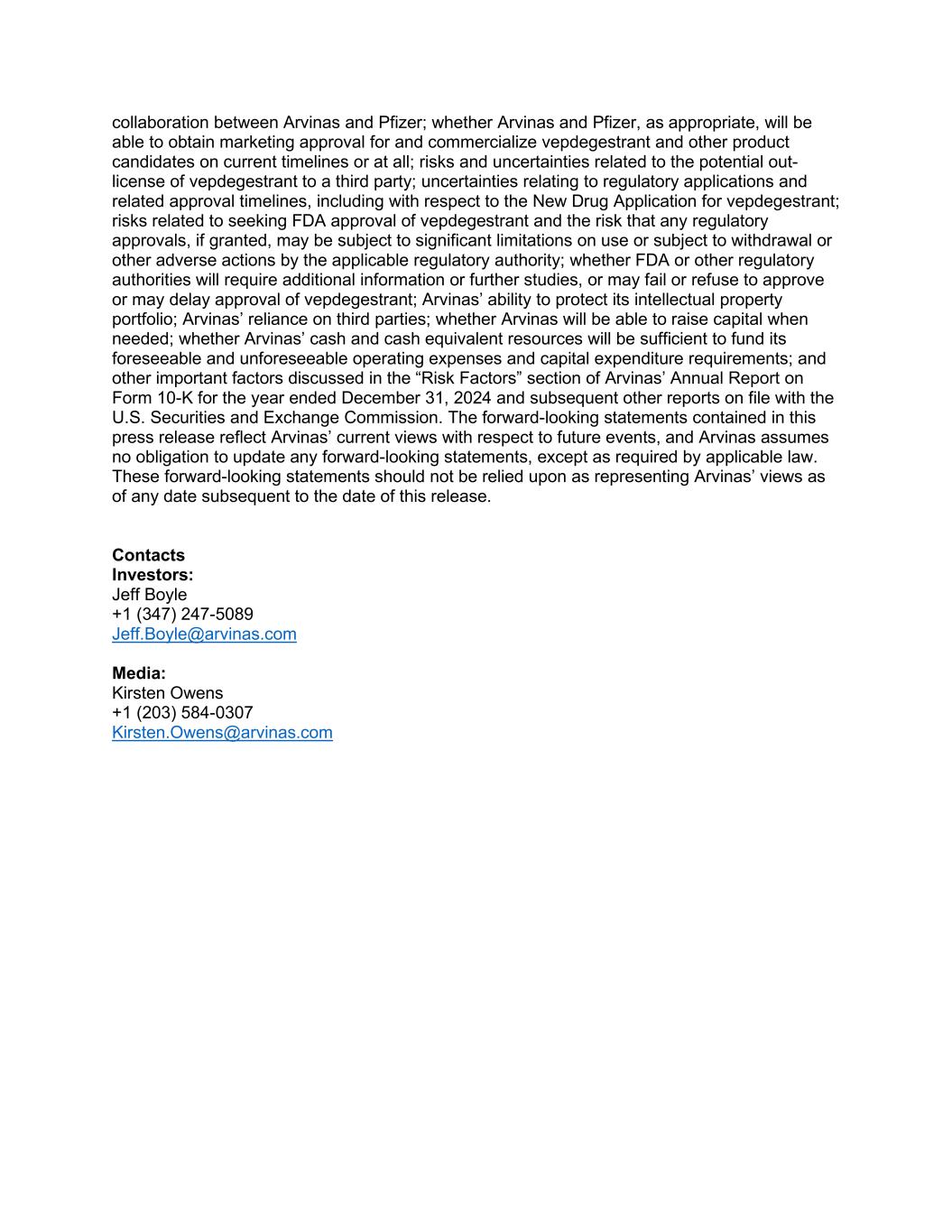 collaboration between Arvinas and Pfizer; whether Arvinas and Pfizer, as appropriate, will be able to obtain marketing approval for and commercialize vepdegestrant and other product candidates on current timelines or at all; risks and uncertainties related to the potential out- license of vepdegestrant to a third party; uncertainties relating to regulatory applications and related approval timelines, including with respect to the New Drug Application for vepdegestrant; risks related to seeking FDA approval of vepdegestrant and the risk that any regulatory approvals, if granted, may be subject to significant limitations on use or subject to withdrawal or other adverse actions by the applicable regulatory authority; whether FDA or other regulatory authorities will require additional information or further studies, or may fail or refuse to approve or may delay approval of vepdegestrant; Arvinas’ ability to protect its intellectual property portfolio; Arvinas’ reliance on third parties; whether Arvinas will be able to raise capital when needed; whether Arvinas’ cash and cash equivalent resources will be sufficient to fund its foreseeable and unforeseeable operating expenses and capital expenditure requirements; and other important factors discussed in the “Risk Factors” section of Arvinas’ Annual Report on Form 10-K for the year ended December 31, 2024 and subsequent other reports on file with the U.S. Securities and Exchange Commission. The forward-looking statements contained in this press release reflect Arvinas’ current views with respect to future events, and Arvinas assumes no obligation to update any forward-looking statements, except as required by applicable law. These forward-looking statements should not be relied upon as representing Arvinas’ views as of any date subsequent to the date of this release. Contacts Investors: Jeff Boyle +1 (347) 247-5089 Jeff.Boyle@arvinas.com Media: Kirsten Owens +1 (203) 584-0307 Kirsten.Owens@arvinas.com