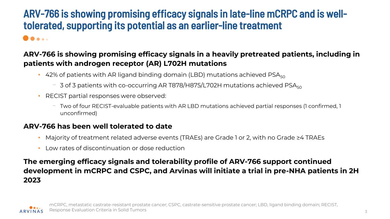 Safe harbor and forward-looking statements 2 This presentation contains forward-looking statements within the meaning of The Private Securities Litigation Reform Act of 1995 that involve substantial risks and uncertainties, including statements regarding the potential advantages and therapeutic benefits of bavdegalutamide (ARV-110) and ARV-766, the development and regulatory status of our product candidates, such as statements with respect to the potential of our lead product candidates bavdegalutamide and ARV-766, the initiation of and timing of the timing of clinical trials, including the timing to complete enrollment, as well as the presentation and/or publication of data from those trials and plans for registration for our product candidates, the potential utility of our technology, the potential commercialization of any of our product candidates, and the sufficiency of our cash resources s. The words “anticipate,” “believe,” “estimate,” “expect,” “intend,” “may,” “might,” “plan,” “predict,” “project,” “target,” “potential,” “will,” “would,” “could,” “should,” “continue,” and similar expressions are intended to identify forward- looking statements, although not all forward-looking statements contain these identifying words. We may not actually achieve the plans, intentions or expectations disclosed in our forward-looking statements, and you should not place undue reliance on our forward-looking statements. Actual results or events could differ materially from the plans, intentions and expectations disclosed in the forward-looking statements we make as a result of various risks and uncertainties, including but not limited to: including but not limited to: whether we will be able to successfully conduct and complete development for bavdegalutamide and ARV-766, whether we initiate and complete clinical trials for our product candidates and receive results from our clinical trials on our expected timelines or at all; obtain marketing approval for and commercialize bavdegalutamide and ARV-766 and our other product candidates on our current timelines or at all; whether our cash and cash equivalent resources will be sufficient to fund our foreseeable and unforeseeable operating expenses and capital expenditure requirements; and other important factors, any of which could cause our actual results to differ from those contained in the forward-looking statements, discussed in the “Risk Factors” section of our quarterly and annual reports on file with the U.S. Securities and Exchange Commission. The forward-looking statements contained in this presentation reflect our current views as of the date of this presentation with respect to future events, and we assume no obligation to update any forward-looking statements, except as required by applicable law. These forward-looking statements should not be relied upon as representing our views as of any date subsequent to the date of this presentation. The Arvinas name and logo are our trademarks. We also own the service mark and the registered U.S. trademark for PROTAC®. The trademarks, trade names and service marks appearing in this presentation are the property of their respective owners. We have omitted the ® and ™ designations, as applicable, for the trademarks named in this presentation. This presentation also contains estimates and other statistical data made by independent parties and by us relating to market size and other data about our industry. This data involves a number of assumptions and limitations, and you are cautioned not to give undue weight to such data and estimates. In addition, projections, assumptions and estimates of our future performance and the future performance of the markets in which we operate are necessarily subject to a high degree of uncertainty and risk. This presentation is intended for the investor community only. It is not intended to promote the products referenced herein or otherwise influence healthcare prescribing decisions. Cross-trial comparisons are not based on head-to-head studies and no direct comparisons can be made.