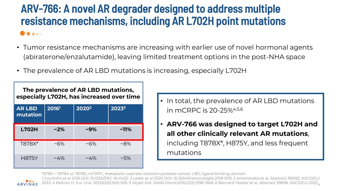 ARV-766: A novel AR degrader designed to address multiple resistance mechanisms, including AR L702H point mutations 4 *878X = T878A or T878S; mCRPC, metastatic castrate-resistant prostate cancer; LBD, ligand binding domain 1 Coutinho et al 2016 DOI: 10.1530/ERC-16-0422. 2 Ledet et al 2020 DOI: 10.1634/theoncologist.2019-0115. 3 Antonarakis et al, Abstract 395182, ASCO/GU 2023. 4 Beltran H. Eur Urol. 2013;63(5):920-926. 5 Wyatt AW. JAMA Oncol.2016;2(12):1598-1606. 6 Bernard-Tessier et al, Abstract 39698, ASCO/GU 2023 • Tumor resistance mechanisms are increasing with earlier use of novel hormonal agents (abiraterone/enzalutamide), leaving limited treatment options in the post-NHA space • The prevalence of AR LBD mutations is increasing, especially L702H AR LBD mutation 20161 20202 20233 L702H ~2% ~9% ~11% T878X* ~6% ~6% ~8% H875Y ~4% ~4% ~5% The prevalence of AR LBD mutations, especially L702H, has increased over time • In total, the prevalence of AR LBD mutations in mCRPC is 20-25%4,5,6 • ARV-766 was designed to target L702H and all other clinically relevant AR mutations, including T878X*, H875Y, and less frequent mutations