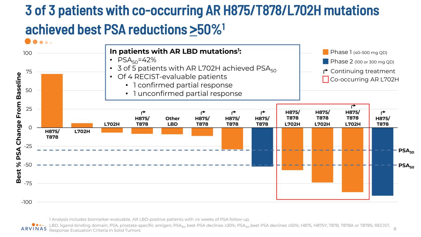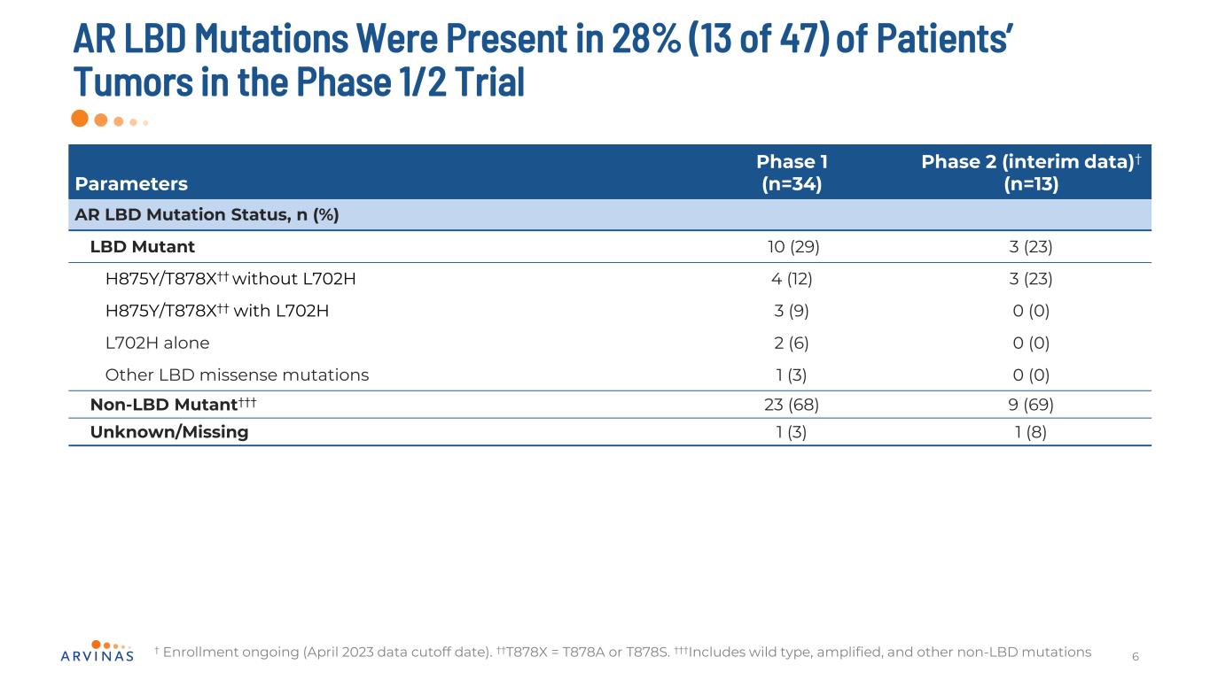 AR LBD Mutations Were Present in 28% (13 of 47) of Patients’ Tumors in the Phase 1/2 Trial 6 Parameters Phase 1 (n=34) Phase 2 (interim data)† (n=13) AR LBD Mutation Status, n (%) LBD Mutant 10 (29) 3 (23) H875Y/T878X†† without L702H 4 (12) 3 (23) H875Y/T878X†† with L702H 3 (9) 0 (0) L702H alone 2 (6) 0 (0) Other LBD missense mutations 1 (3) 0 (0) Non-LBD Mutant††† 23 (68) 9 (69) Unknown/Missing 1 (3) 1 (8) † Enrollment ongoing (April 2023 data cutoff date). ††T878X = T878A or T878S. †††Includes wild type, amplified, and other non-LBD mutations