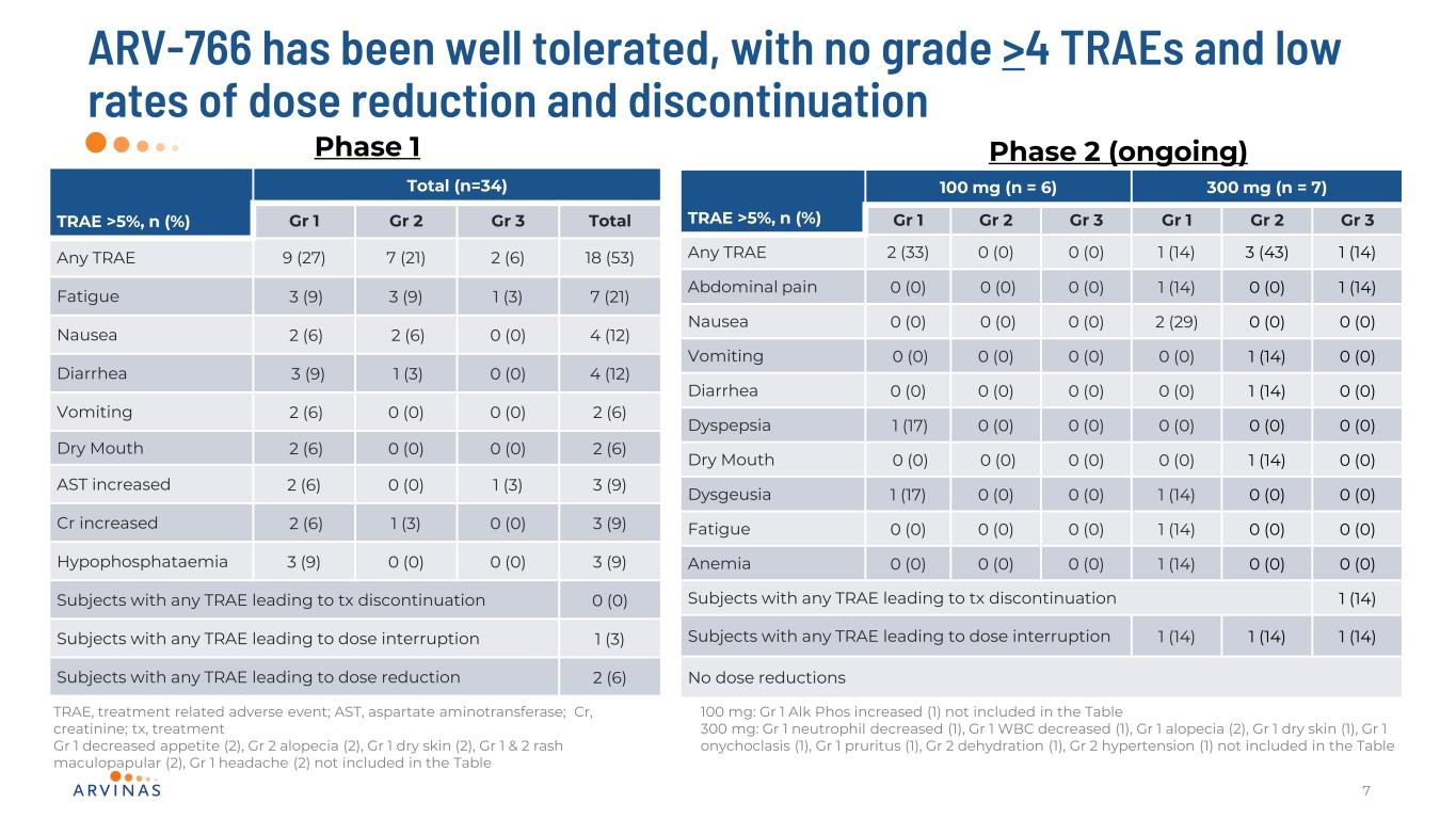 ARV-766 has been well tolerated, with no grade >4 TRAEs and low rates of dose reduction and discontinuation 7 TRAE >5%, n (%) Total (n=34) Gr 1 Gr 2 Gr 3 Total Any TRAE 9 (27) 7 (21) 2 (6) 18 (53) Fatigue 3 (9) 3 (9) 1 (3) 7 (21) Nausea 2 (6) 2 (6) 0 (0) 4 (12) Diarrhea 3 (9) 1 (3) 0 (0) 4 (12) Vomiting 2 (6) 0 (0) 0 (0) 2 (6) Dry Mouth 2 (6) 0 (0) 0 (0) 2 (6) AST increased 2 (6) 0 (0) 1 (3) 3 (9) Cr increased 2 (6) 1 (3) 0 (0) 3 (9) Hypophosphataemia 3 (9) 0 (0) 0 (0) 3 (9) Subjects with any TRAE leading to tx discontinuation 0 (0) Subjects with any TRAE leading to dose interruption 1 (3) Subjects with any TRAE leading to dose reduction 2 (6) TRAE, treatment related adverse event; AST, aspartate aminotransferase; Cr, creatinine; tx, treatment Gr 1 decreased appetite (2), Gr 2 alopecia (2), Gr 1 dry skin (2), Gr 1 & 2 rash maculopapular (2), Gr 1 headache (2) not included in the Table TRAE >5%, n (%) 100 mg (n = 6) 300 mg (n = 7) Gr 1 Gr 2 Gr 3 Gr 1 Gr 2 Gr 3 Any TRAE 2 (33) 0 (0) 0 (0) 1 (14) 3 (43) 1 (14) Abdominal pain 0 (0) 0 (0) 0 (0) 1 (14) 0 (0) 1 (14) Nausea 0 (0) 0 (0) 0 (0) 2 (29) 0 (0) 0 (0) Vomiting 0 (0) 0 (0) 0 (0) 0 (0) 1 (14) 0 (0) Diarrhea 0 (0) 0 (0) 0 (0) 0 (0) 1 (14) 0 (0) Dyspepsia 1 (17) 0 (0) 0 (0) 0 (0) 0 (0) 0 (0) Dry Mouth 0 (0) 0 (0) 0 (0) 0 (0) 1 (14) 0 (0) Dysgeusia 1 (17) 0 (0) 0 (0) 1 (14) 0 (0) 0 (0) Fatigue 0 (0) 0 (0) 0 (0) 1 (14) 0 (0) 0 (0) Anemia 0 (0) 0 (0) 0 (0) 1 (14) 0 (0) 0 (0) Subjects with any TRAE leading to tx discontinuation 1 (14) Subjects with any TRAE leading to dose interruption 1 (14) 1 (14) 1 (14) No dose reductions Phase 1 Phase 2 (ongoing) 100 mg: Gr 1 Alk Phos increased (1) not included in the Table 300 mg: Gr 1 neutrophil decreased (1), Gr 1 WBC decreased (1), Gr 1 alopecia (2), Gr 1 dry skin (1), Gr 1 onychoclasis (1), Gr 1 pruritus (1), Gr 2 dehydration (1), Gr 2 hypertension (1) not included in the Table