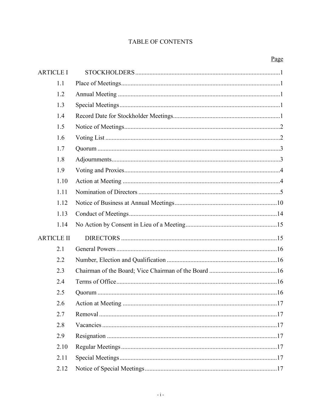 - i - TABLE OF CONTENTS Page ARTICLE I STOCKHOLDERS ............................................................................................1 1.1 Place of Meetings .....................................................................................................1 1.2 Annual Meeting .......................................................................................................1 1.3 Special Meetings ......................................................................................................1 1.4 Record Date for Stockholder Meetings....................................................................1 1.5 Notice of Meetings ...................................................................................................2 1.6 Voting List ...............................................................................................................2 1.7 Quorum ....................................................................................................................3 1.8 Adjournments ...........................................................................................................3 1.9 Voting and Proxies ...................................................................................................4 1.10 Action at Meeting ....................................................................................................4 1.11 Nomination of Directors ..........................................................................................5 1.12 Notice of Business at Annual Meetings .................................................................10 1.13 Conduct of Meetings ..............................................................................................14 1.14 No Action by Consent in Lieu of a Meeting ..........................................................15 ARTICLE II DIRECTORS ...................................................................................................15 2.1 General Powers ......................................................................................................16 2.2 Number, Election and Qualification ......................................................................16 2.3 Chairman of the Board; Vice Chairman of the Board ...........................................16 2.4 Terms of Office ......................................................................................................16 2.5 Quorum ..................................................................................................................16 2.6 Action at Meeting ..................................................................................................17 2.7 Removal .................................................................................................................17 2.8 Vacancies ...............................................................................................................17 2.9 Resignation ............................................................................................................17 2.10 Regular Meetings ...................................................................................................17 2.11 Special Meetings ....................................................................................................17 2.12 Notice of Special Meetings ....................................................................................17