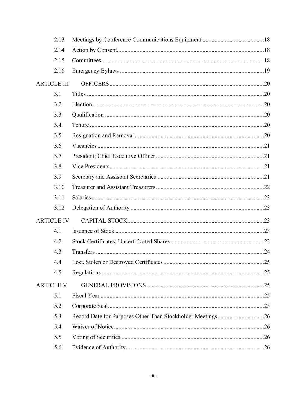 - ii - 2.13 Meetings by Conference Communications Equipment .........................................18 2.14 Action by Consent..................................................................................................18 2.15 Committees ............................................................................................................18 2.16 Emergency Bylaws ................................................................................................19 ARTICLE III OFFICERS .......................................................................................................20 3.1 Titles ......................................................................................................................20 3.2 Election ..................................................................................................................20 3.3 Qualification ..........................................................................................................20 3.4 Tenure ....................................................................................................................20 3.5 Resignation and Removal ......................................................................................20 3.6 Vacancies ...............................................................................................................21 3.7 President; Chief Executive Officer ........................................................................21 3.8 Vice Presidents.......................................................................................................21 3.9 Secretary and Assistant Secretaries .......................................................................21 3.10 Treasurer and Assistant Treasurers ........................................................................22 3.11 Salaries ...................................................................................................................23 3.12 Delegation of Authority .........................................................................................23 ARTICLE IV CAPITAL STOCK...........................................................................................23 4.1 Issuance of Stock ...................................................................................................23 4.2 Stock Certificates; Uncertificated Shares ..............................................................23 4.3 Transfers ................................................................................................................24 4.4 Lost, Stolen or Destroyed Certificates ...................................................................25 4.5 Regulations ............................................................................................................25 ARTICLE V GENERAL PROVISIONS ..............................................................................25 5.1 Fiscal Year .............................................................................................................25 5.2 Corporate Seal ........................................................................................................25 5.3 Record Date for Purposes Other Than Stockholder Meetings ...............................26 5.4 Waiver of Notice ....................................................................................................26 5.5 Voting of Securities ...............................................................................................26 5.6 Evidence of Authority ............................................................................................26