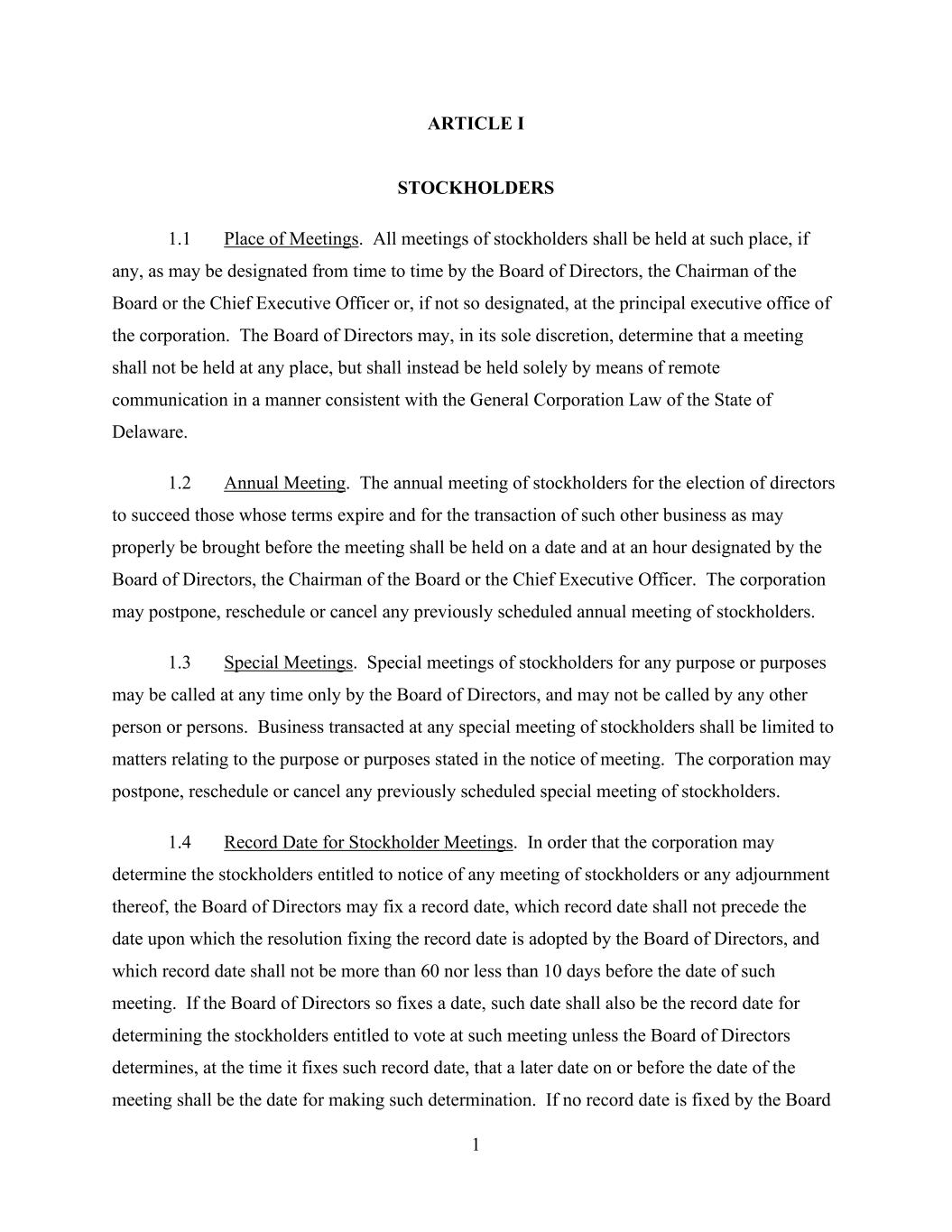 1 ARTICLE I STOCKHOLDERS 1.1 Place of Meetings. All meetings of stockholders shall be held at such place, if any, as may be designated from time to time by the Board of Directors, the Chairman of the Board or the Chief Executive Officer or, if not so designated, at the principal executive office of the corporation. The Board of Directors may, in its sole discretion, determine that a meeting shall not be held at any place, but shall instead be held solely by means of remote communication in a manner consistent with the General Corporation Law of the State of Delaware. 1.2 Annual Meeting. The annual meeting of stockholders for the election of directors to succeed those whose terms expire and for the transaction of such other business as may properly be brought before the meeting shall be held on a date and at an hour designated by the Board of Directors, the Chairman of the Board or the Chief Executive Officer. The corporation may postpone, reschedule or cancel any previously scheduled annual meeting of stockholders. 1.3 Special Meetings. Special meetings of stockholders for any purpose or purposes may be called at any time only by the Board of Directors, and may not be called by any other person or persons. Business transacted at any special meeting of stockholders shall be limited to matters relating to the purpose or purposes stated in the notice of meeting. The corporation may postpone, reschedule or cancel any previously scheduled special meeting of stockholders. 1.4 Record Date for Stockholder Meetings. In order that the corporation may determine the stockholders entitled to notice of any meeting of stockholders or any adjournment thereof, the Board of Directors may fix a record date, which record date shall not precede the date upon which the resolution fixing the record date is adopted by the Board of Directors, and which record date shall not be more than 60 nor less than 10 days before the date of such meeting. If the Board of Directors so fixes a date, such date shall also be the record date for determining the stockholders entitled to vote at such meeting unless the Board of Directors determines, at the time it fixes such record date, that a later date on or before the date of the meeting shall be the date for making such determination. If no record date is fixed by the Board