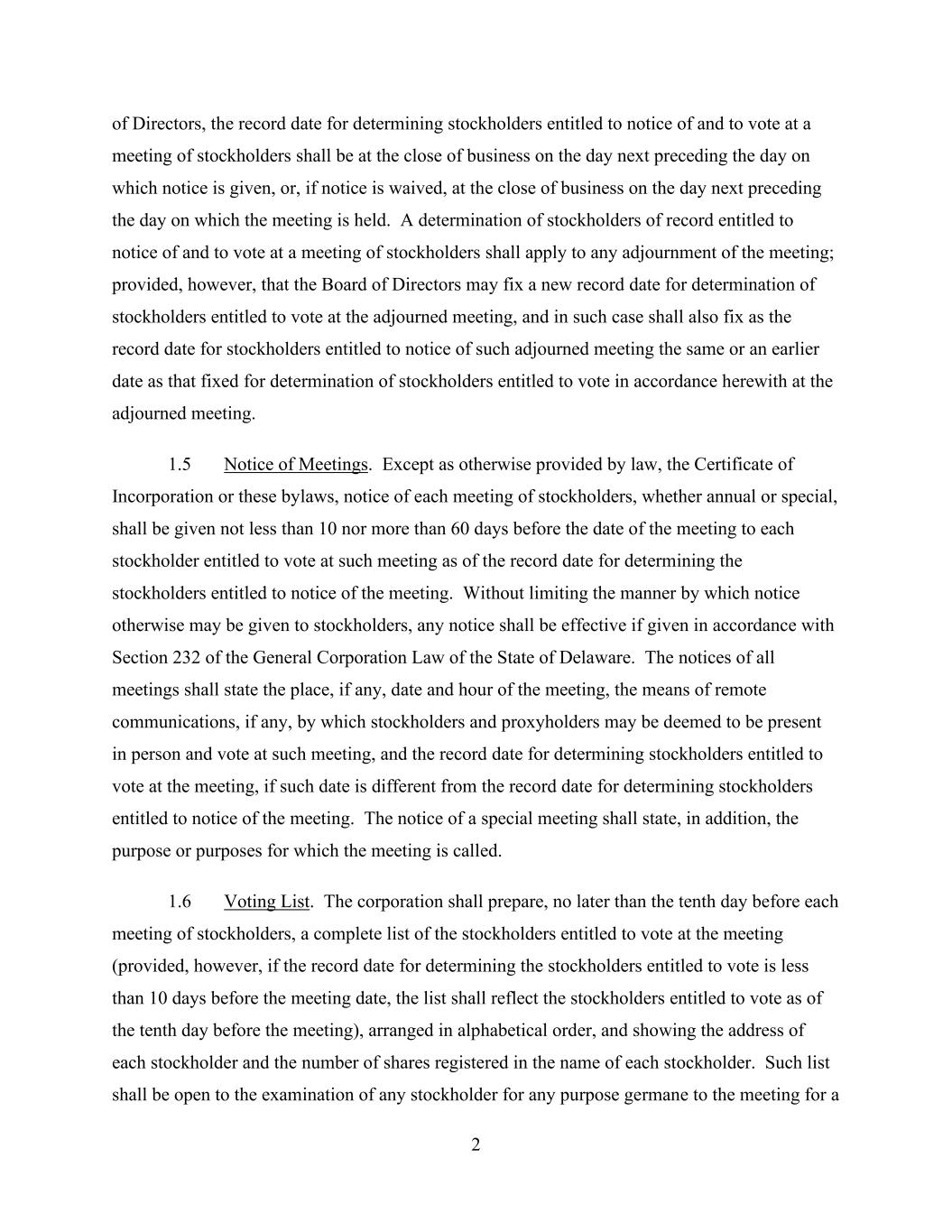 2 of Directors, the record date for determining stockholders entitled to notice of and to vote at a meeting of stockholders shall be at the close of business on the day next preceding the day on which notice is given, or, if notice is waived, at the close of business on the day next preceding the day on which the meeting is held. A determination of stockholders of record entitled to notice of and to vote at a meeting of stockholders shall apply to any adjournment of the meeting; provided, however, that the Board of Directors may fix a new record date for determination of stockholders entitled to vote at the adjourned meeting, and in such case shall also fix as the record date for stockholders entitled to notice of such adjourned meeting the same or an earlier date as that fixed for determination of stockholders entitled to vote in accordance herewith at the adjourned meeting. 1.5 Notice of Meetings. Except as otherwise provided by law, the Certificate of Incorporation or these bylaws, notice of each meeting of stockholders, whether annual or special, shall be given not less than 10 nor more than 60 days before the date of the meeting to each stockholder entitled to vote at such meeting as of the record date for determining the stockholders entitled to notice of the meeting. Without limiting the manner by which notice otherwise may be given to stockholders, any notice shall be effective if given in accordance with Section 232 of the General Corporation Law of the State of Delaware. The notices of all meetings shall state the place, if any, date and hour of the meeting, the means of remote communications, if any, by which stockholders and proxyholders may be deemed to be present in person and vote at such meeting, and the record date for determining stockholders entitled to vote at the meeting, if such date is different from the record date for determining stockholders entitled to notice of the meeting. The notice of a special meeting shall state, in addition, the purpose or purposes for which the meeting is called. 1.6 Voting List. The corporation shall prepare, no later than the tenth day before each meeting of stockholders, a complete list of the stockholders entitled to vote at the meeting (provided, however, if the record date for determining the stockholders entitled to vote is less than 10 days before the meeting date, the list shall reflect the stockholders entitled to vote as of the tenth day before the meeting), arranged in alphabetical order, and showing the address of each stockholder and the number of shares registered in the name of each stockholder. Such list shall be open to the examination of any stockholder for any purpose germane to the meeting for a