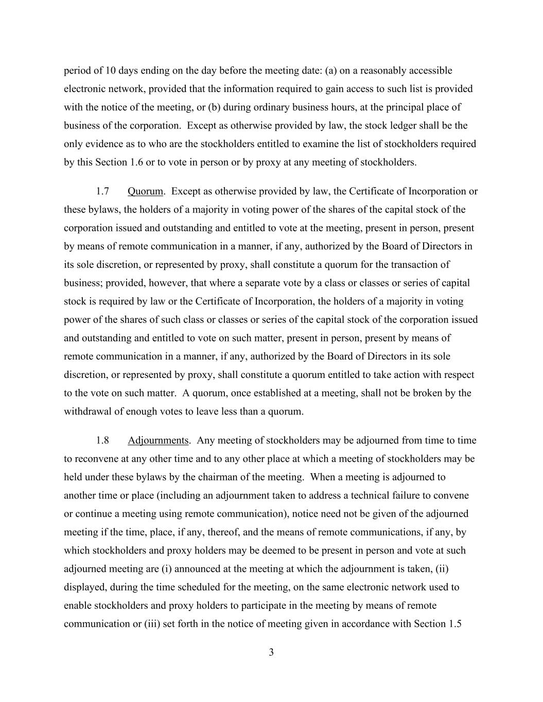 3 period of 10 days ending on the day before the meeting date: (a) on a reasonably accessible electronic network, provided that the information required to gain access to such list is provided with the notice of the meeting, or (b) during ordinary business hours, at the principal place of business of the corporation. Except as otherwise provided by law, the stock ledger shall be the only evidence as to who are the stockholders entitled to examine the list of stockholders required by this Section 1.6 or to vote in person or by proxy at any meeting of stockholders. 1.7 Quorum. Except as otherwise provided by law, the Certificate of Incorporation or these bylaws, the holders of a majority in voting power of the shares of the capital stock of the corporation issued and outstanding and entitled to vote at the meeting, present in person, present by means of remote communication in a manner, if any, authorized by the Board of Directors in its sole discretion, or represented by proxy, shall constitute a quorum for the transaction of business; provided, however, that where a separate vote by a class or classes or series of capital stock is required by law or the Certificate of Incorporation, the holders of a majority in voting power of the shares of such class or classes or series of the capital stock of the corporation issued and outstanding and entitled to vote on such matter, present in person, present by means of remote communication in a manner, if any, authorized by the Board of Directors in its sole discretion, or represented by proxy, shall constitute a quorum entitled to take action with respect to the vote on such matter. A quorum, once established at a meeting, shall not be broken by the withdrawal of enough votes to leave less than a quorum. 1.8 Adjournments. Any meeting of stockholders may be adjourned from time to time to reconvene at any other time and to any other place at which a meeting of stockholders may be held under these bylaws by the chairman of the meeting. When a meeting is adjourned to another time or place (including an adjournment taken to address a technical failure to convene or continue a meeting using remote communication), notice need not be given of the adjourned meeting if the time, place, if any, thereof, and the means of remote communications, if any, by which stockholders and proxy holders may be deemed to be present in person and vote at such adjourned meeting are (i) announced at the meeting at which the adjournment is taken, (ii) displayed, during the time scheduled for the meeting, on the same electronic network used to enable stockholders and proxy holders to participate in the meeting by means of remote communication or (iii) set forth in the notice of meeting given in accordance with Section 1.5