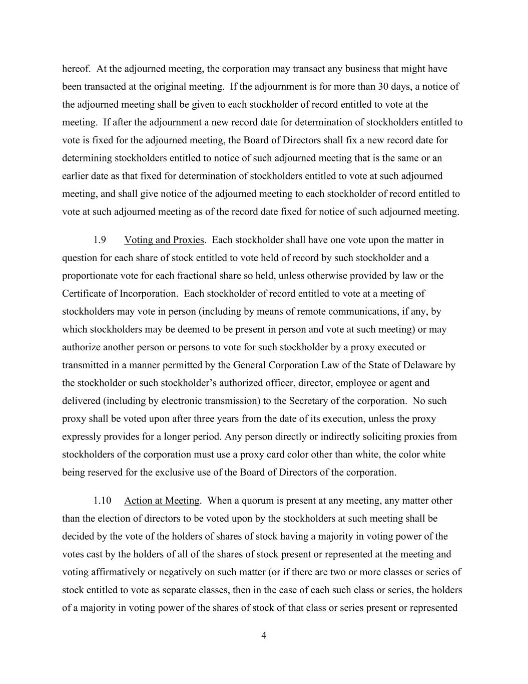 4 hereof. At the adjourned meeting, the corporation may transact any business that might have been transacted at the original meeting. If the adjournment is for more than 30 days, a notice of the adjourned meeting shall be given to each stockholder of record entitled to vote at the meeting. If after the adjournment a new record date for determination of stockholders entitled to vote is fixed for the adjourned meeting, the Board of Directors shall fix a new record date for determining stockholders entitled to notice of such adjourned meeting that is the same or an earlier date as that fixed for determination of stockholders entitled to vote at such adjourned meeting, and shall give notice of the adjourned meeting to each stockholder of record entitled to vote at such adjourned meeting as of the record date fixed for notice of such adjourned meeting. 1.9 Voting and Proxies. Each stockholder shall have one vote upon the matter in question for each share of stock entitled to vote held of record by such stockholder and a proportionate vote for each fractional share so held, unless otherwise provided by law or the Certificate of Incorporation. Each stockholder of record entitled to vote at a meeting of stockholders may vote in person (including by means of remote communications, if any, by which stockholders may be deemed to be present in person and vote at such meeting) or may authorize another person or persons to vote for such stockholder by a proxy executed or transmitted in a manner permitted by the General Corporation Law of the State of Delaware by the stockholder or such stockholder’s authorized officer, director, employee or agent and delivered (including by electronic transmission) to the Secretary of the corporation. No such proxy shall be voted upon after three years from the date of its execution, unless the proxy expressly provides for a longer period. Any person directly or indirectly soliciting proxies from stockholders of the corporation must use a proxy card color other than white, the color white being reserved for the exclusive use of the Board of Directors of the corporation. 1.10 Action at Meeting. When a quorum is present at any meeting, any matter other than the election of directors to be voted upon by the stockholders at such meeting shall be decided by the vote of the holders of shares of stock having a majority in voting power of the votes cast by the holders of all of the shares of stock present or represented at the meeting and voting affirmatively or negatively on such matter (or if there are two or more classes or series of stock entitled to vote as separate classes, then in the case of each such class or series, the holders of a majority in voting power of the shares of stock of that class or series present or represented