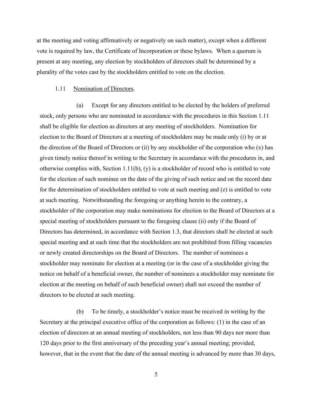 5 at the meeting and voting affirmatively or negatively on such matter), except when a different vote is required by law, the Certificate of Incorporation or these bylaws. When a quorum is present at any meeting, any election by stockholders of directors shall be determined by a plurality of the votes cast by the stockholders entitled to vote on the election. 1.11 Nomination of Directors. (a) Except for any directors entitled to be elected by the holders of preferred stock, only persons who are nominated in accordance with the procedures in this Section 1.11 shall be eligible for election as directors at any meeting of stockholders. Nomination for election to the Board of Directors at a meeting of stockholders may be made only (i) by or at the direction of the Board of Directors or (ii) by any stockholder of the corporation who (x) has given timely notice thereof in writing to the Secretary in accordance with the procedures in, and otherwise complies with, Section 1.11(b), (y) is a stockholder of record who is entitled to vote for the election of such nominee on the date of the giving of such notice and on the record date for the determination of stockholders entitled to vote at such meeting and (z) is entitled to vote at such meeting. Notwithstanding the foregoing or anything herein to the contrary, a stockholder of the corporation may make nominations for election to the Board of Directors at a special meeting of stockholders pursuant to the foregoing clause (ii) only if the Board of Directors has determined, in accordance with Section 1.3, that directors shall be elected at such special meeting and at such time that the stockholders are not prohibited from filling vacancies or newly created directorships on the Board of Directors. The number of nominees a stockholder may nominate for election at a meeting (or in the case of a stockholder giving the notice on behalf of a beneficial owner, the number of nominees a stockholder may nominate for election at the meeting on behalf of such beneficial owner) shall not exceed the number of directors to be elected at such meeting. (b) To be timely, a stockholder’s notice must be received in writing by the Secretary at the principal executive office of the corporation as follows: (1) in the case of an election of directors at an annual meeting of stockholders, not less than 90 days nor more than 120 days prior to the first anniversary of the preceding year’s annual meeting; provided, however, that in the event that the date of the annual meeting is advanced by more than 30 days,