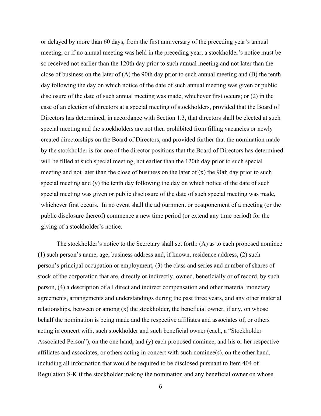 6 or delayed by more than 60 days, from the first anniversary of the preceding year’s annual meeting, or if no annual meeting was held in the preceding year, a stockholder’s notice must be so received not earlier than the 120th day prior to such annual meeting and not later than the close of business on the later of (A) the 90th day prior to such annual meeting and (B) the tenth day following the day on which notice of the date of such annual meeting was given or public disclosure of the date of such annual meeting was made, whichever first occurs; or (2) in the case of an election of directors at a special meeting of stockholders, provided that the Board of Directors has determined, in accordance with Section 1.3, that directors shall be elected at such special meeting and the stockholders are not then prohibited from filling vacancies or newly created directorships on the Board of Directors, and provided further that the nomination made by the stockholder is for one of the director positions that the Board of Directors has determined will be filled at such special meeting, not earlier than the 120th day prior to such special meeting and not later than the close of business on the later of (x) the 90th day prior to such special meeting and (y) the tenth day following the day on which notice of the date of such special meeting was given or public disclosure of the date of such special meeting was made, whichever first occurs. In no event shall the adjournment or postponement of a meeting (or the public disclosure thereof) commence a new time period (or extend any time period) for the giving of a stockholder’s notice. The stockholder’s notice to the Secretary shall set forth: (A) as to each proposed nominee (1) such person’s name, age, business address and, if known, residence address, (2) such person’s principal occupation or employment, (3) the class and series and number of shares of stock of the corporation that are, directly or indirectly, owned, beneficially or of record, by such person, (4) a description of all direct and indirect compensation and other material monetary agreements, arrangements and understandings during the past three years, and any other material relationships, between or among (x) the stockholder, the beneficial owner, if any, on whose behalf the nomination is being made and the respective affiliates and associates of, or others acting in concert with, such stockholder and such beneficial owner (each, a “Stockholder Associated Person”), on the one hand, and (y) each proposed nominee, and his or her respective affiliates and associates, or others acting in concert with such nominee(s), on the other hand, including all information that would be required to be disclosed pursuant to Item 404 of Regulation S-K if the stockholder making the nomination and any beneficial owner on whose
