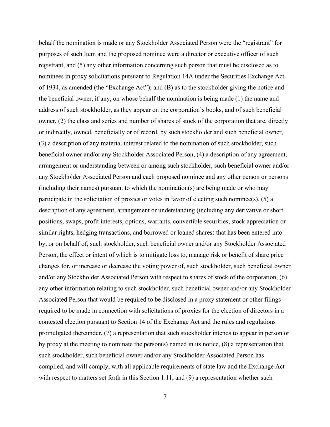 7 behalf the nomination is made or any Stockholder Associated Person were the “registrant” for purposes of such Item and the proposed nominee were a director or executive officer of such registrant, and (5) any other information concerning such person that must be disclosed as to nominees in proxy solicitations pursuant to Regulation 14A under the Securities Exchange Act of 1934, as amended (the “Exchange Act”); and (B) as to the stockholder giving the notice and the beneficial owner, if any, on whose behalf the nomination is being made (1) the name and address of such stockholder, as they appear on the corporation’s books, and of such beneficial owner, (2) the class and series and number of shares of stock of the corporation that are, directly or indirectly, owned, beneficially or of record, by such stockholder and such beneficial owner, (3) a description of any material interest related to the nomination of such stockholder, such beneficial owner and/or any Stockholder Associated Person, (4) a description of any agreement, arrangement or understanding between or among such stockholder, such beneficial owner and/or any Stockholder Associated Person and each proposed nominee and any other person or persons (including their names) pursuant to which the nomination(s) are being made or who may participate in the solicitation of proxies or votes in favor of electing such nominee(s), (5) a description of any agreement, arrangement or understanding (including any derivative or short positions, swaps, profit interests, options, warrants, convertible securities, stock appreciation or similar rights, hedging transactions, and borrowed or loaned shares) that has been entered into by, or on behalf of, such stockholder, such beneficial owner and/or any Stockholder Associated Person, the effect or intent of which is to mitigate loss to, manage risk or benefit of share price changes for, or increase or decrease the voting power of, such stockholder, such beneficial owner and/or any Stockholder Associated Person with respect to shares of stock of the corporation, (6) any other information relating to such stockholder, such beneficial owner and/or any Stockholder Associated Person that would be required to be disclosed in a proxy statement or other filings required to be made in connection with solicitations of proxies for the election of directors in a contested election pursuant to Section 14 of the Exchange Act and the rules and regulations promulgated thereunder, (7) a representation that such stockholder intends to appear in person or by proxy at the meeting to nominate the person(s) named in its notice, (8) a representation that such stockholder, such beneficial owner and/or any Stockholder Associated Person has complied, and will comply, with all applicable requirements of state law and the Exchange Act with respect to matters set forth in this Section 1.11, and (9) a representation whether such