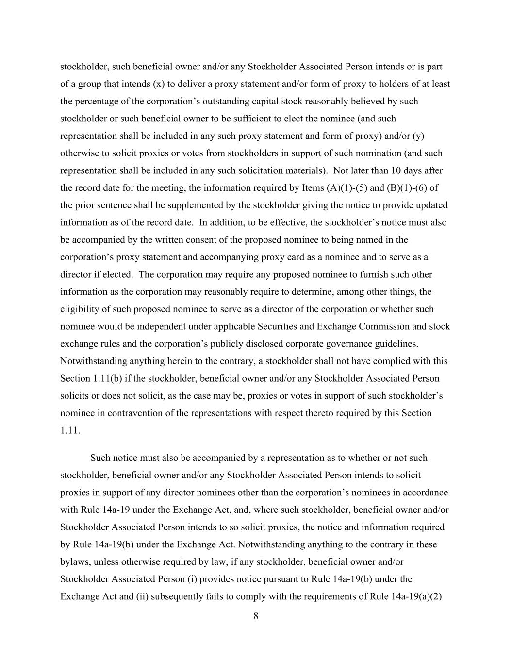8 stockholder, such beneficial owner and/or any Stockholder Associated Person intends or is part of a group that intends (x) to deliver a proxy statement and/or form of proxy to holders of at least the percentage of the corporation’s outstanding capital stock reasonably believed by such stockholder or such beneficial owner to be sufficient to elect the nominee (and such representation shall be included in any such proxy statement and form of proxy) and/or (y) otherwise to solicit proxies or votes from stockholders in support of such nomination (and such representation shall be included in any such solicitation materials). Not later than 10 days after the record date for the meeting, the information required by Items (A)(1)-(5) and (B)(1)-(6) of the prior sentence shall be supplemented by the stockholder giving the notice to provide updated information as of the record date. In addition, to be effective, the stockholder’s notice must also be accompanied by the written consent of the proposed nominee to being named in the corporation’s proxy statement and accompanying proxy card as a nominee and to serve as a director if elected. The corporation may require any proposed nominee to furnish such other information as the corporation may reasonably require to determine, among other things, the eligibility of such proposed nominee to serve as a director of the corporation or whether such nominee would be independent under applicable Securities and Exchange Commission and stock exchange rules and the corporation’s publicly disclosed corporate governance guidelines. Notwithstanding anything herein to the contrary, a stockholder shall not have complied with this Section 1.11(b) if the stockholder, beneficial owner and/or any Stockholder Associated Person solicits or does not solicit, as the case may be, proxies or votes in support of such stockholder’s nominee in contravention of the representations with respect thereto required by this Section 1.11. Such notice must also be accompanied by a representation as to whether or not such stockholder, beneficial owner and/or any Stockholder Associated Person intends to solicit proxies in support of any director nominees other than the corporation’s nominees in accordance with Rule 14a-19 under the Exchange Act, and, where such stockholder, beneficial owner and/or Stockholder Associated Person intends to so solicit proxies, the notice and information required by Rule 14a-19(b) under the Exchange Act. Notwithstanding anything to the contrary in these bylaws, unless otherwise required by law, if any stockholder, beneficial owner and/or Stockholder Associated Person (i) provides notice pursuant to Rule 14a-19(b) under the Exchange Act and (ii) subsequently fails to comply with the requirements of Rule 14a-19(a)(2)