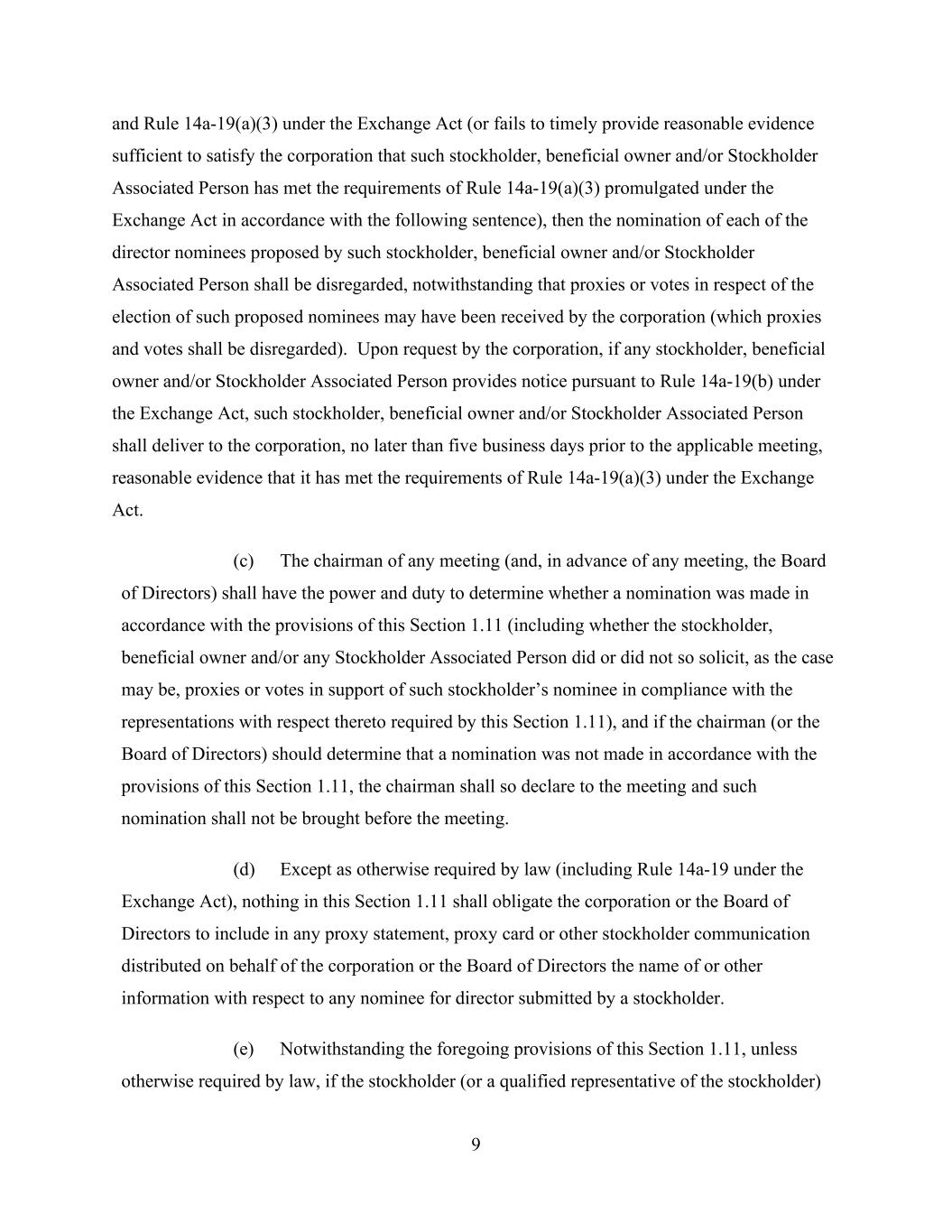 9 and Rule 14a-19(a)(3) under the Exchange Act (or fails to timely provide reasonable evidence sufficient to satisfy the corporation that such stockholder, beneficial owner and/or Stockholder Associated Person has met the requirements of Rule 14a-19(a)(3) promulgated under the Exchange Act in accordance with the following sentence), then the nomination of each of the director nominees proposed by such stockholder, beneficial owner and/or Stockholder Associated Person shall be disregarded, notwithstanding that proxies or votes in respect of the election of such proposed nominees may have been received by the corporation (which proxies and votes shall be disregarded). Upon request by the corporation, if any stockholder, beneficial owner and/or Stockholder Associated Person provides notice pursuant to Rule 14a-19(b) under the Exchange Act, such stockholder, beneficial owner and/or Stockholder Associated Person shall deliver to the corporation, no later than five business days prior to the applicable meeting, reasonable evidence that it has met the requirements of Rule 14a-19(a)(3) under the Exchange Act. (c) The chairman of any meeting (and, in advance of any meeting, the Board of Directors) shall have the power and duty to determine whether a nomination was made in accordance with the provisions of this Section 1.11 (including whether the stockholder, beneficial owner and/or any Stockholder Associated Person did or did not so solicit, as the case may be, proxies or votes in support of such stockholder’s nominee in compliance with the representations with respect thereto required by this Section 1.11), and if the chairman (or the Board of Directors) should determine that a nomination was not made in accordance with the provisions of this Section 1.11, the chairman shall so declare to the meeting and such nomination shall not be brought before the meeting. (d) Except as otherwise required by law (including Rule 14a-19 under the Exchange Act), nothing in this Section 1.11 shall obligate the corporation or the Board of Directors to include in any proxy statement, proxy card or other stockholder communication distributed on behalf of the corporation or the Board of Directors the name of or other information with respect to any nominee for director submitted by a stockholder. (e) Notwithstanding the foregoing provisions of this Section 1.11, unless otherwise required by law, if the stockholder (or a qualified representative of the stockholder)