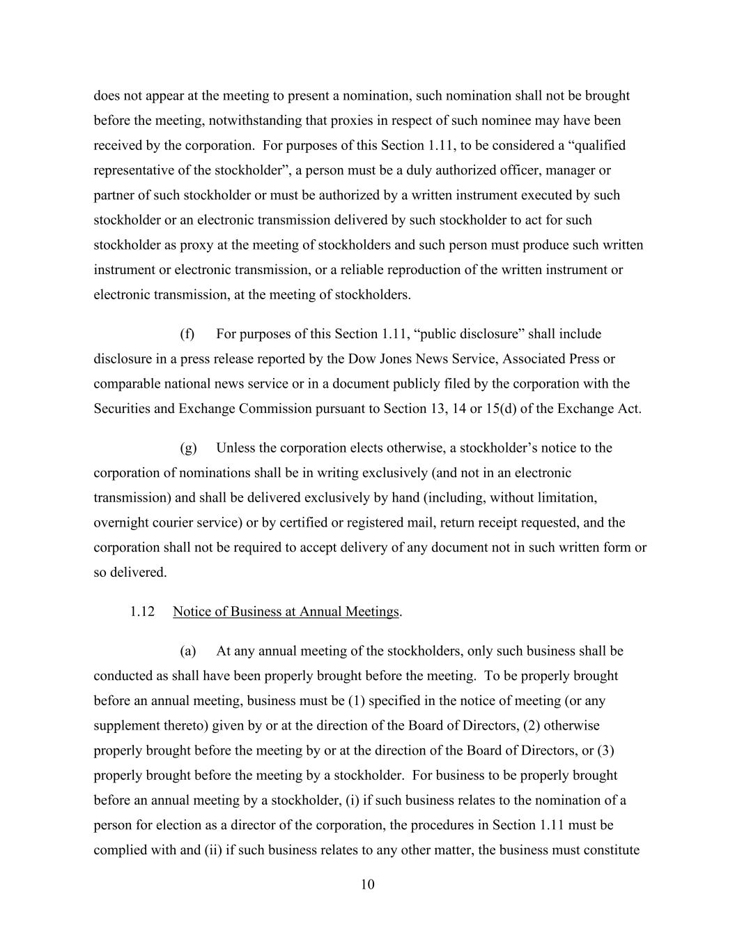 10 does not appear at the meeting to present a nomination, such nomination shall not be brought before the meeting, notwithstanding that proxies in respect of such nominee may have been received by the corporation. For purposes of this Section 1.11, to be considered a “qualified representative of the stockholder”, a person must be a duly authorized officer, manager or partner of such stockholder or must be authorized by a written instrument executed by such stockholder or an electronic transmission delivered by such stockholder to act for such stockholder as proxy at the meeting of stockholders and such person must produce such written instrument or electronic transmission, or a reliable reproduction of the written instrument or electronic transmission, at the meeting of stockholders. (f) For purposes of this Section 1.11, “public disclosure” shall include disclosure in a press release reported by the Dow Jones News Service, Associated Press or comparable national news service or in a document publicly filed by the corporation with the Securities and Exchange Commission pursuant to Section 13, 14 or 15(d) of the Exchange Act. (g) Unless the corporation elects otherwise, a stockholder’s notice to the corporation of nominations shall be in writing exclusively (and not in an electronic transmission) and shall be delivered exclusively by hand (including, without limitation, overnight courier service) or by certified or registered mail, return receipt requested, and the corporation shall not be required to accept delivery of any document not in such written form or so delivered. 1.12 Notice of Business at Annual Meetings. (a) At any annual meeting of the stockholders, only such business shall be conducted as shall have been properly brought before the meeting. To be properly brought before an annual meeting, business must be (1) specified in the notice of meeting (or any supplement thereto) given by or at the direction of the Board of Directors, (2) otherwise properly brought before the meeting by or at the direction of the Board of Directors, or (3) properly brought before the meeting by a stockholder. For business to be properly brought before an annual meeting by a stockholder, (i) if such business relates to the nomination of a person for election as a director of the corporation, the procedures in Section 1.11 must be complied with and (ii) if such business relates to any other matter, the business must constitute