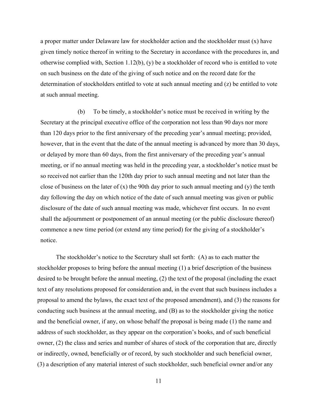 11 a proper matter under Delaware law for stockholder action and the stockholder must (x) have given timely notice thereof in writing to the Secretary in accordance with the procedures in, and otherwise complied with, Section 1.12(b), (y) be a stockholder of record who is entitled to vote on such business on the date of the giving of such notice and on the record date for the determination of stockholders entitled to vote at such annual meeting and (z) be entitled to vote at such annual meeting. (b) To be timely, a stockholder’s notice must be received in writing by the Secretary at the principal executive office of the corporation not less than 90 days nor more than 120 days prior to the first anniversary of the preceding year’s annual meeting; provided, however, that in the event that the date of the annual meeting is advanced by more than 30 days, or delayed by more than 60 days, from the first anniversary of the preceding year’s annual meeting, or if no annual meeting was held in the preceding year, a stockholder’s notice must be so received not earlier than the 120th day prior to such annual meeting and not later than the close of business on the later of (x) the 90th day prior to such annual meeting and (y) the tenth day following the day on which notice of the date of such annual meeting was given or public disclosure of the date of such annual meeting was made, whichever first occurs. In no event shall the adjournment or postponement of an annual meeting (or the public disclosure thereof) commence a new time period (or extend any time period) for the giving of a stockholder’s notice. The stockholder’s notice to the Secretary shall set forth: (A) as to each matter the stockholder proposes to bring before the annual meeting (1) a brief description of the business desired to be brought before the annual meeting, (2) the text of the proposal (including the exact text of any resolutions proposed for consideration and, in the event that such business includes a proposal to amend the bylaws, the exact text of the proposed amendment), and (3) the reasons for conducting such business at the annual meeting, and (B) as to the stockholder giving the notice and the beneficial owner, if any, on whose behalf the proposal is being made (1) the name and address of such stockholder, as they appear on the corporation’s books, and of such beneficial owner, (2) the class and series and number of shares of stock of the corporation that are, directly or indirectly, owned, beneficially or of record, by such stockholder and such beneficial owner, (3) a description of any material interest of such stockholder, such beneficial owner and/or any