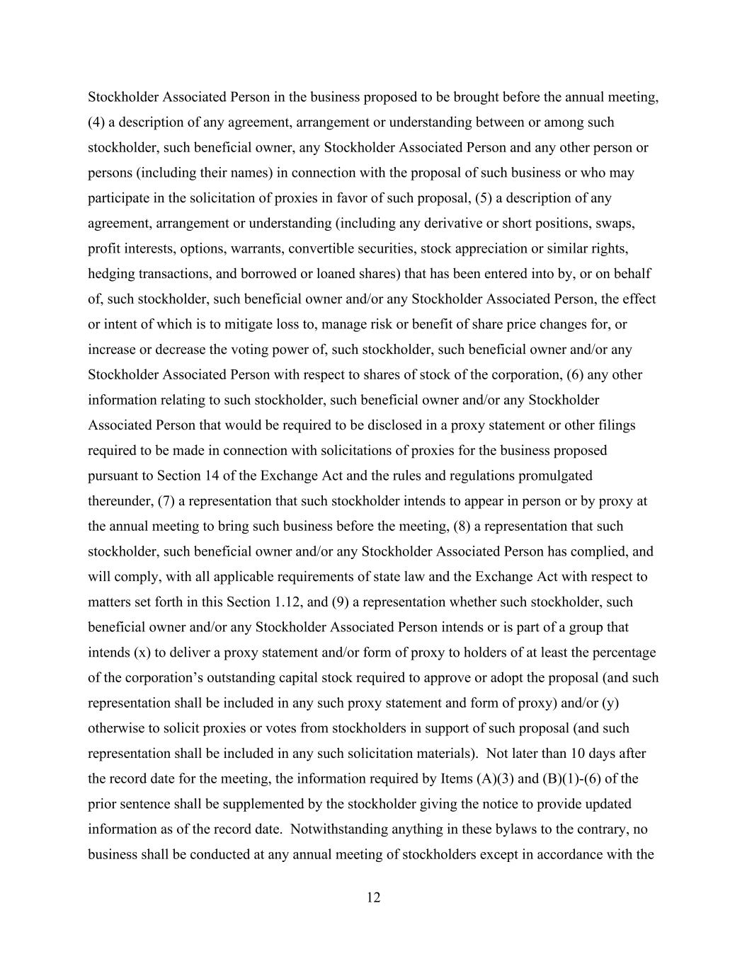 12 Stockholder Associated Person in the business proposed to be brought before the annual meeting, (4) a description of any agreement, arrangement or understanding between or among such stockholder, such beneficial owner, any Stockholder Associated Person and any other person or persons (including their names) in connection with the proposal of such business or who may participate in the solicitation of proxies in favor of such proposal, (5) a description of any agreement, arrangement or understanding (including any derivative or short positions, swaps, profit interests, options, warrants, convertible securities, stock appreciation or similar rights, hedging transactions, and borrowed or loaned shares) that has been entered into by, or on behalf of, such stockholder, such beneficial owner and/or any Stockholder Associated Person, the effect or intent of which is to mitigate loss to, manage risk or benefit of share price changes for, or increase or decrease the voting power of, such stockholder, such beneficial owner and/or any Stockholder Associated Person with respect to shares of stock of the corporation, (6) any other information relating to such stockholder, such beneficial owner and/or any Stockholder Associated Person that would be required to be disclosed in a proxy statement or other filings required to be made in connection with solicitations of proxies for the business proposed pursuant to Section 14 of the Exchange Act and the rules and regulations promulgated thereunder, (7) a representation that such stockholder intends to appear in person or by proxy at the annual meeting to bring such business before the meeting, (8) a representation that such stockholder, such beneficial owner and/or any Stockholder Associated Person has complied, and will comply, with all applicable requirements of state law and the Exchange Act with respect to matters set forth in this Section 1.12, and (9) a representation whether such stockholder, such beneficial owner and/or any Stockholder Associated Person intends or is part of a group that intends (x) to deliver a proxy statement and/or form of proxy to holders of at least the percentage of the corporation’s outstanding capital stock required to approve or adopt the proposal (and such representation shall be included in any such proxy statement and form of proxy) and/or (y) otherwise to solicit proxies or votes from stockholders in support of such proposal (and such representation shall be included in any such solicitation materials). Not later than 10 days after the record date for the meeting, the information required by Items (A)(3) and (B)(1)-(6) of the prior sentence shall be supplemented by the stockholder giving the notice to provide updated information as of the record date. Notwithstanding anything in these bylaws to the contrary, no business shall be conducted at any annual meeting of stockholders except in accordance with the