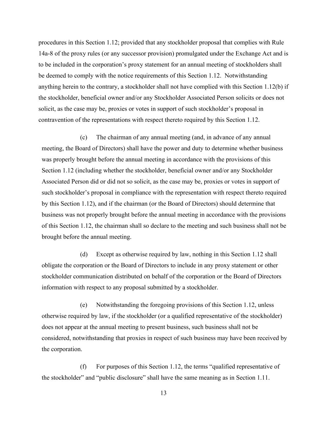 13 procedures in this Section 1.12; provided that any stockholder proposal that complies with Rule 14a-8 of the proxy rules (or any successor provision) promulgated under the Exchange Act and is to be included in the corporation’s proxy statement for an annual meeting of stockholders shall be deemed to comply with the notice requirements of this Section 1.12. Notwithstanding anything herein to the contrary, a stockholder shall not have complied with this Section 1.12(b) if the stockholder, beneficial owner and/or any Stockholder Associated Person solicits or does not solicit, as the case may be, proxies or votes in support of such stockholder’s proposal in contravention of the representations with respect thereto required by this Section 1.12. (c) The chairman of any annual meeting (and, in advance of any annual meeting, the Board of Directors) shall have the power and duty to determine whether business was properly brought before the annual meeting in accordance with the provisions of this Section 1.12 (including whether the stockholder, beneficial owner and/or any Stockholder Associated Person did or did not so solicit, as the case may be, proxies or votes in support of such stockholder’s proposal in compliance with the representation with respect thereto required by this Section 1.12), and if the chairman (or the Board of Directors) should determine that business was not properly brought before the annual meeting in accordance with the provisions of this Section 1.12, the chairman shall so declare to the meeting and such business shall not be brought before the annual meeting. (d) Except as otherwise required by law, nothing in this Section 1.12 shall obligate the corporation or the Board of Directors to include in any proxy statement or other stockholder communication distributed on behalf of the corporation or the Board of Directors information with respect to any proposal submitted by a stockholder. (e) Notwithstanding the foregoing provisions of this Section 1.12, unless otherwise required by law, if the stockholder (or a qualified representative of the stockholder) does not appear at the annual meeting to present business, such business shall not be considered, notwithstanding that proxies in respect of such business may have been received by the corporation. (f) For purposes of this Section 1.12, the terms “qualified representative of the stockholder” and “public disclosure” shall have the same meaning as in Section 1.11.