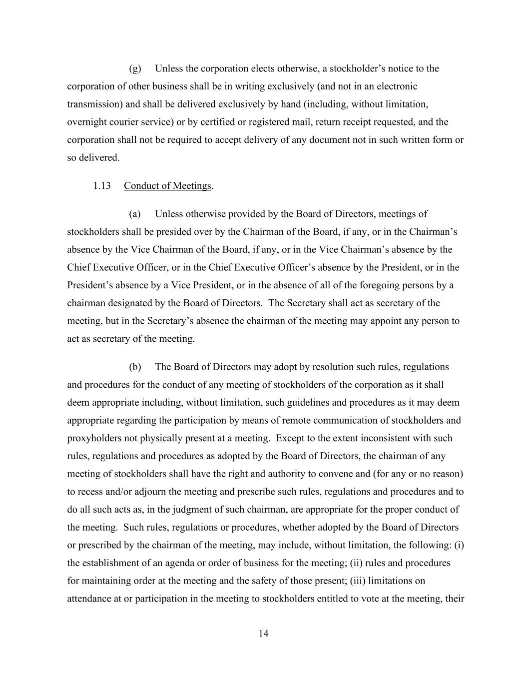 14 (g) Unless the corporation elects otherwise, a stockholder’s notice to the corporation of other business shall be in writing exclusively (and not in an electronic transmission) and shall be delivered exclusively by hand (including, without limitation, overnight courier service) or by certified or registered mail, return receipt requested, and the corporation shall not be required to accept delivery of any document not in such written form or so delivered. 1.13 Conduct of Meetings. (a) Unless otherwise provided by the Board of Directors, meetings of stockholders shall be presided over by the Chairman of the Board, if any, or in the Chairman’s absence by the Vice Chairman of the Board, if any, or in the Vice Chairman’s absence by the Chief Executive Officer, or in the Chief Executive Officer’s absence by the President, or in the President’s absence by a Vice President, or in the absence of all of the foregoing persons by a chairman designated by the Board of Directors. The Secretary shall act as secretary of the meeting, but in the Secretary’s absence the chairman of the meeting may appoint any person to act as secretary of the meeting. (b) The Board of Directors may adopt by resolution such rules, regulations and procedures for the conduct of any meeting of stockholders of the corporation as it shall deem appropriate including, without limitation, such guidelines and procedures as it may deem appropriate regarding the participation by means of remote communication of stockholders and proxyholders not physically present at a meeting. Except to the extent inconsistent with such rules, regulations and procedures as adopted by the Board of Directors, the chairman of any meeting of stockholders shall have the right and authority to convene and (for any or no reason) to recess and/or adjourn the meeting and prescribe such rules, regulations and procedures and to do all such acts as, in the judgment of such chairman, are appropriate for the proper conduct of the meeting. Such rules, regulations or procedures, whether adopted by the Board of Directors or prescribed by the chairman of the meeting, may include, without limitation, the following: (i) the establishment of an agenda or order of business for the meeting; (ii) rules and procedures for maintaining order at the meeting and the safety of those present; (iii) limitations on attendance at or participation in the meeting to stockholders entitled to vote at the meeting, their