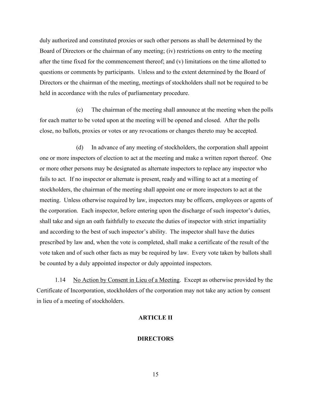 15 duly authorized and constituted proxies or such other persons as shall be determined by the Board of Directors or the chairman of any meeting; (iv) restrictions on entry to the meeting after the time fixed for the commencement thereof; and (v) limitations on the time allotted to questions or comments by participants. Unless and to the extent determined by the Board of Directors or the chairman of the meeting, meetings of stockholders shall not be required to be held in accordance with the rules of parliamentary procedure. (c) The chairman of the meeting shall announce at the meeting when the polls for each matter to be voted upon at the meeting will be opened and closed. After the polls close, no ballots, proxies or votes or any revocations or changes thereto may be accepted. (d) In advance of any meeting of stockholders, the corporation shall appoint one or more inspectors of election to act at the meeting and make a written report thereof. One or more other persons may be designated as alternate inspectors to replace any inspector who fails to act. If no inspector or alternate is present, ready and willing to act at a meeting of stockholders, the chairman of the meeting shall appoint one or more inspectors to act at the meeting. Unless otherwise required by law, inspectors may be officers, employees or agents of the corporation. Each inspector, before entering upon the discharge of such inspector’s duties, shall take and sign an oath faithfully to execute the duties of inspector with strict impartiality and according to the best of such inspector’s ability. The inspector shall have the duties prescribed by law and, when the vote is completed, shall make a certificate of the result of the vote taken and of such other facts as may be required by law. Every vote taken by ballots shall be counted by a duly appointed inspector or duly appointed inspectors. 1.14 No Action by Consent in Lieu of a Meeting. Except as otherwise provided by the Certificate of Incorporation, stockholders of the corporation may not take any action by consent in lieu of a meeting of stockholders. ARTICLE II DIRECTORS