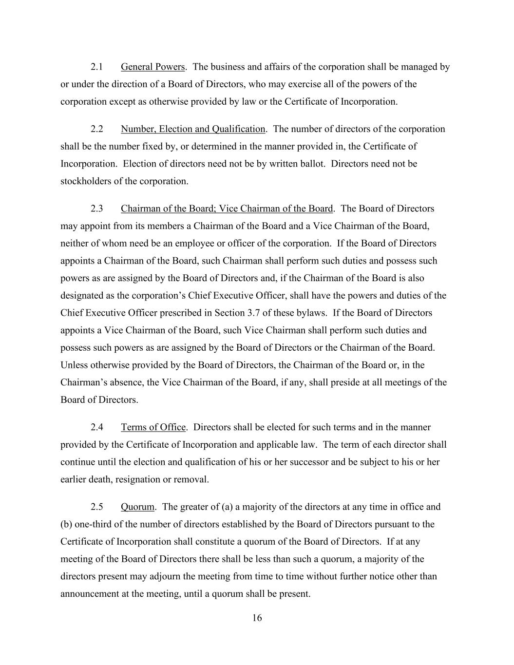 16 2.1 General Powers. The business and affairs of the corporation shall be managed by or under the direction of a Board of Directors, who may exercise all of the powers of the corporation except as otherwise provided by law or the Certificate of Incorporation. 2.2 Number, Election and Qualification. The number of directors of the corporation shall be the number fixed by, or determined in the manner provided in, the Certificate of Incorporation. Election of directors need not be by written ballot. Directors need not be stockholders of the corporation. 2.3 Chairman of the Board; Vice Chairman of the Board. The Board of Directors may appoint from its members a Chairman of the Board and a Vice Chairman of the Board, neither of whom need be an employee or officer of the corporation. If the Board of Directors appoints a Chairman of the Board, such Chairman shall perform such duties and possess such powers as are assigned by the Board of Directors and, if the Chairman of the Board is also designated as the corporation’s Chief Executive Officer, shall have the powers and duties of the Chief Executive Officer prescribed in Section 3.7 of these bylaws. If the Board of Directors appoints a Vice Chairman of the Board, such Vice Chairman shall perform such duties and possess such powers as are assigned by the Board of Directors or the Chairman of the Board. Unless otherwise provided by the Board of Directors, the Chairman of the Board or, in the Chairman’s absence, the Vice Chairman of the Board, if any, shall preside at all meetings of the Board of Directors. 2.4 Terms of Office. Directors shall be elected for such terms and in the manner provided by the Certificate of Incorporation and applicable law. The term of each director shall continue until the election and qualification of his or her successor and be subject to his or her earlier death, resignation or removal. 2.5 Quorum. The greater of (a) a majority of the directors at any time in office and (b) one-third of the number of directors established by the Board of Directors pursuant to the Certificate of Incorporation shall constitute a quorum of the Board of Directors. If at any meeting of the Board of Directors there shall be less than such a quorum, a majority of the directors present may adjourn the meeting from time to time without further notice other than announcement at the meeting, until a quorum shall be present.