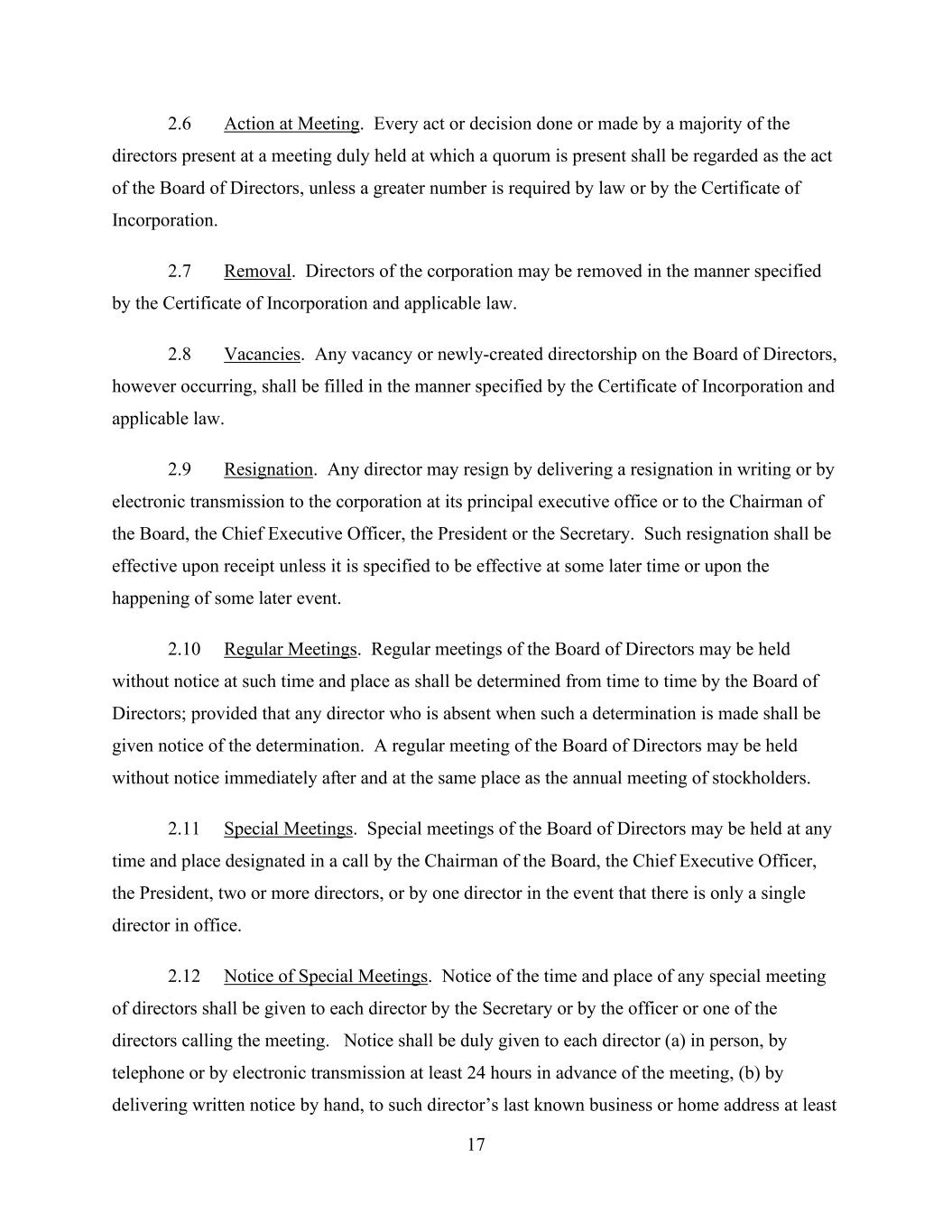 17 2.6 Action at Meeting. Every act or decision done or made by a majority of the directors present at a meeting duly held at which a quorum is present shall be regarded as the act of the Board of Directors, unless a greater number is required by law or by the Certificate of Incorporation. 2.7 Removal. Directors of the corporation may be removed in the manner specified by the Certificate of Incorporation and applicable law. 2.8 Vacancies. Any vacancy or newly-created directorship on the Board of Directors, however occurring, shall be filled in the manner specified by the Certificate of Incorporation and applicable law. 2.9 Resignation. Any director may resign by delivering a resignation in writing or by electronic transmission to the corporation at its principal executive office or to the Chairman of the Board, the Chief Executive Officer, the President or the Secretary. Such resignation shall be effective upon receipt unless it is specified to be effective at some later time or upon the happening of some later event. 2.10 Regular Meetings. Regular meetings of the Board of Directors may be held without notice at such time and place as shall be determined from time to time by the Board of Directors; provided that any director who is absent when such a determination is made shall be given notice of the determination. A regular meeting of the Board of Directors may be held without notice immediately after and at the same place as the annual meeting of stockholders. 2.11 Special Meetings. Special meetings of the Board of Directors may be held at any time and place designated in a call by the Chairman of the Board, the Chief Executive Officer, the President, two or more directors, or by one director in the event that there is only a single director in office. 2.12 Notice of Special Meetings. Notice of the time and place of any special meeting of directors shall be given to each director by the Secretary or by the officer or one of the directors calling the meeting. Notice shall be duly given to each director (a) in person, by telephone or by electronic transmission at least 24 hours in advance of the meeting, (b) by delivering written notice by hand, to such director’s last known business or home address at least