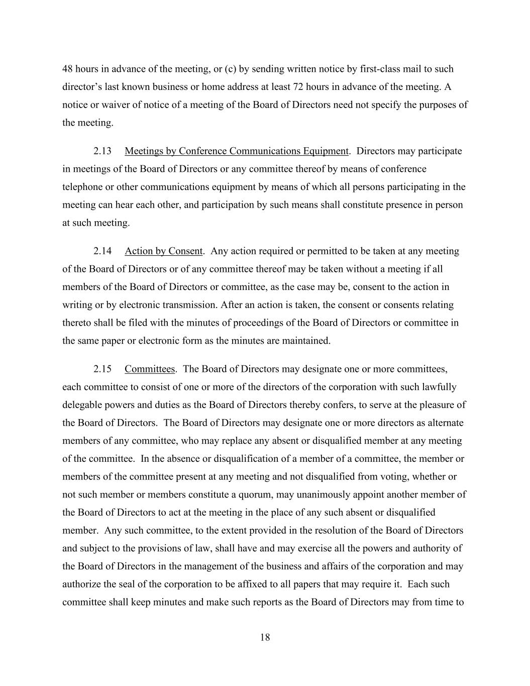 18 48 hours in advance of the meeting, or (c) by sending written notice by first-class mail to such director’s last known business or home address at least 72 hours in advance of the meeting. A notice or waiver of notice of a meeting of the Board of Directors need not specify the purposes of the meeting. 2.13 Meetings by Conference Communications Equipment. Directors may participate in meetings of the Board of Directors or any committee thereof by means of conference telephone or other communications equipment by means of which all persons participating in the meeting can hear each other, and participation by such means shall constitute presence in person at such meeting. 2.14 Action by Consent. Any action required or permitted to be taken at any meeting of the Board of Directors or of any committee thereof may be taken without a meeting if all members of the Board of Directors or committee, as the case may be, consent to the action in writing or by electronic transmission. After an action is taken, the consent or consents relating thereto shall be filed with the minutes of proceedings of the Board of Directors or committee in the same paper or electronic form as the minutes are maintained. 2.15 Committees. The Board of Directors may designate one or more committees, each committee to consist of one or more of the directors of the corporation with such lawfully delegable powers and duties as the Board of Directors thereby confers, to serve at the pleasure of the Board of Directors. The Board of Directors may designate one or more directors as alternate members of any committee, who may replace any absent or disqualified member at any meeting of the committee. In the absence or disqualification of a member of a committee, the member or members of the committee present at any meeting and not disqualified from voting, whether or not such member or members constitute a quorum, may unanimously appoint another member of the Board of Directors to act at the meeting in the place of any such absent or disqualified member. Any such committee, to the extent provided in the resolution of the Board of Directors and subject to the provisions of law, shall have and may exercise all the powers and authority of the Board of Directors in the management of the business and affairs of the corporation and may authorize the seal of the corporation to be affixed to all papers that may require it. Each such committee shall keep minutes and make such reports as the Board of Directors may from time to