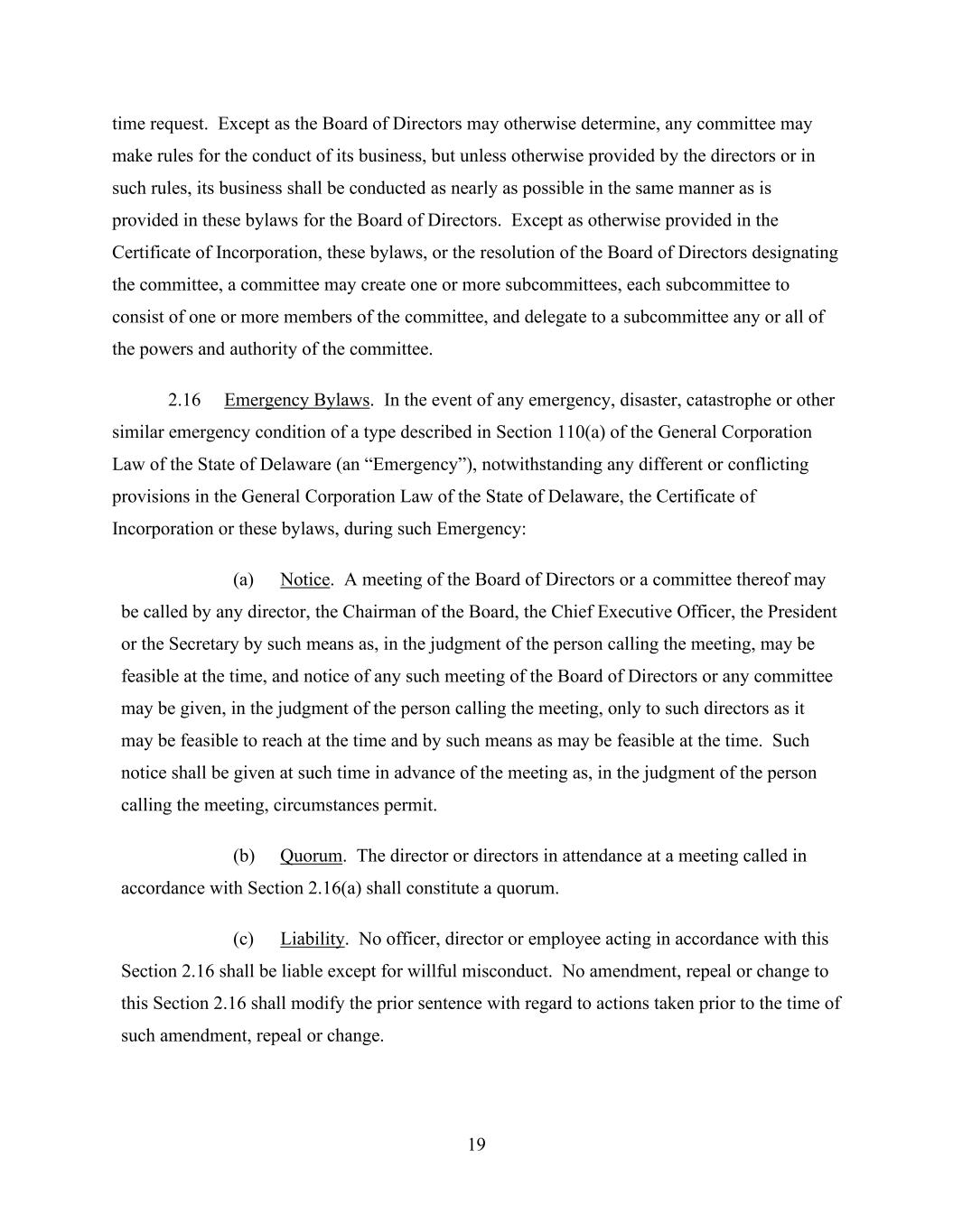 19 time request. Except as the Board of Directors may otherwise determine, any committee may make rules for the conduct of its business, but unless otherwise provided by the directors or in such rules, its business shall be conducted as nearly as possible in the same manner as is provided in these bylaws for the Board of Directors. Except as otherwise provided in the Certificate of Incorporation, these bylaws, or the resolution of the Board of Directors designating the committee, a committee may create one or more subcommittees, each subcommittee to consist of one or more members of the committee, and delegate to a subcommittee any or all of the powers and authority of the committee. 2.16 Emergency Bylaws. In the event of any emergency, disaster, catastrophe or other similar emergency condition of a type described in Section 110(a) of the General Corporation Law of the State of Delaware (an “Emergency”), notwithstanding any different or conflicting provisions in the General Corporation Law of the State of Delaware, the Certificate of Incorporation or these bylaws, during such Emergency: (a) Notice. A meeting of the Board of Directors or a committee thereof may be called by any director, the Chairman of the Board, the Chief Executive Officer, the President or the Secretary by such means as, in the judgment of the person calling the meeting, may be feasible at the time, and notice of any such meeting of the Board of Directors or any committee may be given, in the judgment of the person calling the meeting, only to such directors as it may be feasible to reach at the time and by such means as may be feasible at the time. Such notice shall be given at such time in advance of the meeting as, in the judgment of the person calling the meeting, circumstances permit. (b) Quorum. The director or directors in attendance at a meeting called in accordance with Section 2.16(a) shall constitute a quorum. (c) Liability. No officer, director or employee acting in accordance with this Section 2.16 shall be liable except for willful misconduct. No amendment, repeal or change to this Section 2.16 shall modify the prior sentence with regard to actions taken prior to the time of such amendment, repeal or change.