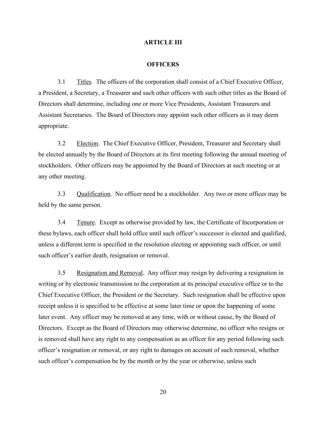 20 ARTICLE III OFFICERS 3.1 Titles. The officers of the corporation shall consist of a Chief Executive Officer, a President, a Secretary, a Treasurer and such other officers with such other titles as the Board of Directors shall determine, including one or more Vice Presidents, Assistant Treasurers and Assistant Secretaries. The Board of Directors may appoint such other officers as it may deem appropriate. 3.2 Election. The Chief Executive Officer, President, Treasurer and Secretary shall be elected annually by the Board of Directors at its first meeting following the annual meeting of stockholders. Other officers may be appointed by the Board of Directors at such meeting or at any other meeting. 3.3 Qualification. No officer need be a stockholder. Any two or more offices may be held by the same person. 3.4 Tenure. Except as otherwise provided by law, the Certificate of Incorporation or these bylaws, each officer shall hold office until such officer’s successor is elected and qualified, unless a different term is specified in the resolution electing or appointing such officer, or until such officer’s earlier death, resignation or removal. 3.5 Resignation and Removal. Any officer may resign by delivering a resignation in writing or by electronic transmission to the corporation at its principal executive office or to the Chief Executive Officer, the President or the Secretary. Such resignation shall be effective upon receipt unless it is specified to be effective at some later time or upon the happening of some later event. Any officer may be removed at any time, with or without cause, by the Board of Directors. Except as the Board of Directors may otherwise determine, no officer who resigns or is removed shall have any right to any compensation as an officer for any period following such officer’s resignation or removal, or any right to damages on account of such removal, whether such officer’s compensation be by the month or by the year or otherwise, unless such