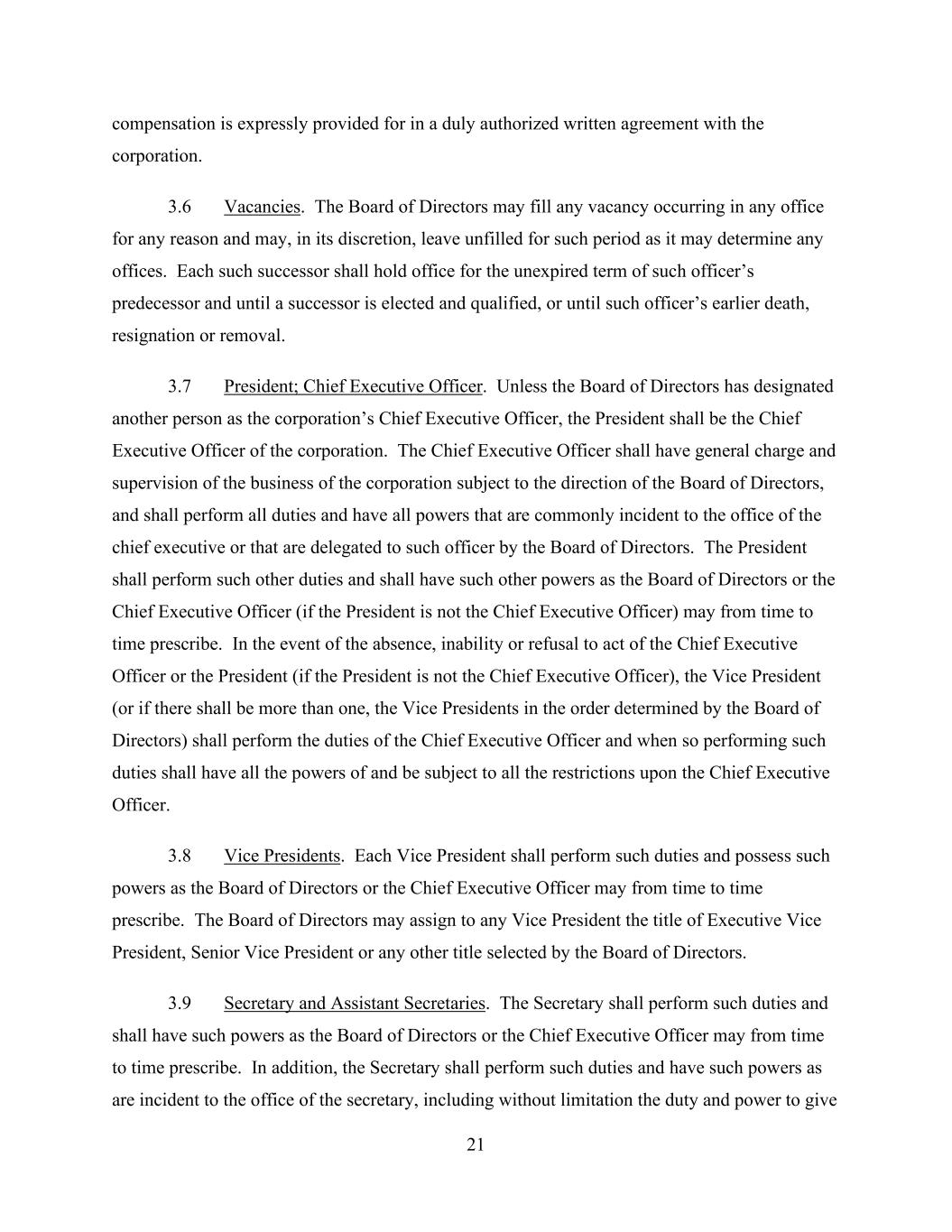 21 compensation is expressly provided for in a duly authorized written agreement with the corporation. 3.6 Vacancies. The Board of Directors may fill any vacancy occurring in any office for any reason and may, in its discretion, leave unfilled for such period as it may determine any offices. Each such successor shall hold office for the unexpired term of such officer’s predecessor and until a successor is elected and qualified, or until such officer’s earlier death, resignation or removal. 3.7 President; Chief Executive Officer. Unless the Board of Directors has designated another person as the corporation’s Chief Executive Officer, the President shall be the Chief Executive Officer of the corporation. The Chief Executive Officer shall have general charge and supervision of the business of the corporation subject to the direction of the Board of Directors, and shall perform all duties and have all powers that are commonly incident to the office of the chief executive or that are delegated to such officer by the Board of Directors. The President shall perform such other duties and shall have such other powers as the Board of Directors or the Chief Executive Officer (if the President is not the Chief Executive Officer) may from time to time prescribe. In the event of the absence, inability or refusal to act of the Chief Executive Officer or the President (if the President is not the Chief Executive Officer), the Vice President (or if there shall be more than one, the Vice Presidents in the order determined by the Board of Directors) shall perform the duties of the Chief Executive Officer and when so performing such duties shall have all the powers of and be subject to all the restrictions upon the Chief Executive Officer. 3.8 Vice Presidents. Each Vice President shall perform such duties and possess such powers as the Board of Directors or the Chief Executive Officer may from time to time prescribe. The Board of Directors may assign to any Vice President the title of Executive Vice President, Senior Vice President or any other title selected by the Board of Directors. 3.9 Secretary and Assistant Secretaries. The Secretary shall perform such duties and shall have such powers as the Board of Directors or the Chief Executive Officer may from time to time prescribe. In addition, the Secretary shall perform such duties and have such powers as are incident to the office of the secretary, including without limitation the duty and power to give