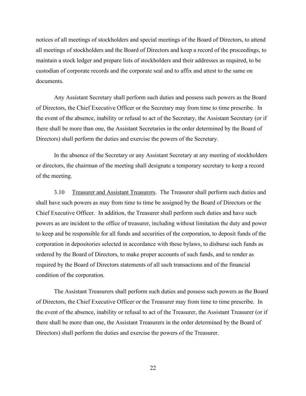 22 notices of all meetings of stockholders and special meetings of the Board of Directors, to attend all meetings of stockholders and the Board of Directors and keep a record of the proceedings, to maintain a stock ledger and prepare lists of stockholders and their addresses as required, to be custodian of corporate records and the corporate seal and to affix and attest to the same on documents. Any Assistant Secretary shall perform such duties and possess such powers as the Board of Directors, the Chief Executive Officer or the Secretary may from time to time prescribe. In the event of the absence, inability or refusal to act of the Secretary, the Assistant Secretary (or if there shall be more than one, the Assistant Secretaries in the order determined by the Board of Directors) shall perform the duties and exercise the powers of the Secretary. In the absence of the Secretary or any Assistant Secretary at any meeting of stockholders or directors, the chairman of the meeting shall designate a temporary secretary to keep a record of the meeting. 3.10 Treasurer and Assistant Treasurers. The Treasurer shall perform such duties and shall have such powers as may from time to time be assigned by the Board of Directors or the Chief Executive Officer. In addition, the Treasurer shall perform such duties and have such powers as are incident to the office of treasurer, including without limitation the duty and power to keep and be responsible for all funds and securities of the corporation, to deposit funds of the corporation in depositories selected in accordance with these bylaws, to disburse such funds as ordered by the Board of Directors, to make proper accounts of such funds, and to render as required by the Board of Directors statements of all such transactions and of the financial condition of the corporation. The Assistant Treasurers shall perform such duties and possess such powers as the Board of Directors, the Chief Executive Officer or the Treasurer may from time to time prescribe. In the event of the absence, inability or refusal to act of the Treasurer, the Assistant Treasurer (or if there shall be more than one, the Assistant Treasurers in the order determined by the Board of Directors) shall perform the duties and exercise the powers of the Treasurer.