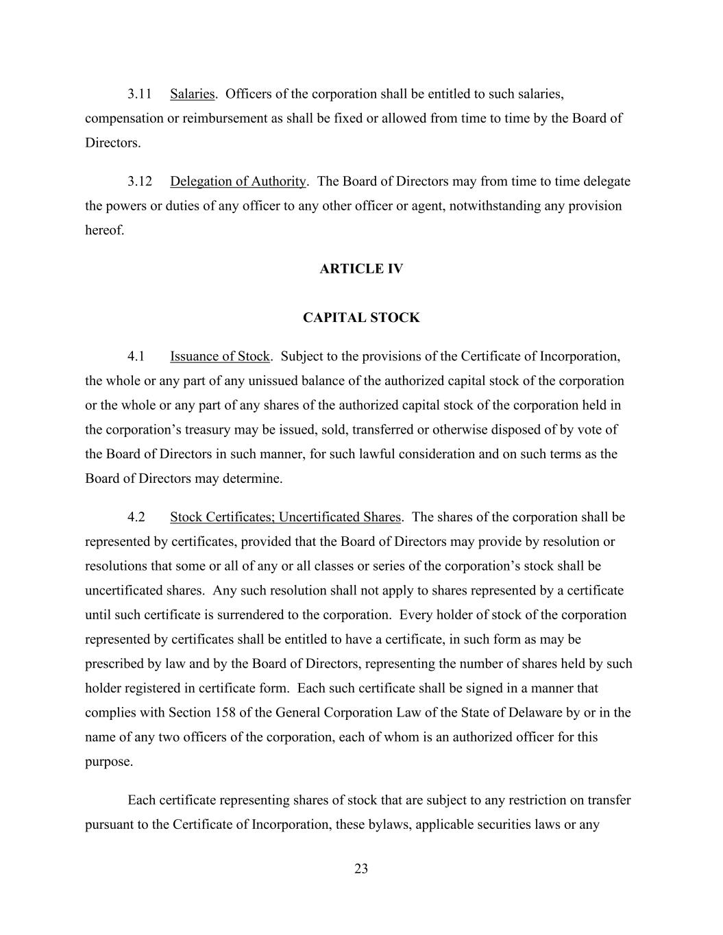 23 3.11 Salaries. Officers of the corporation shall be entitled to such salaries, compensation or reimbursement as shall be fixed or allowed from time to time by the Board of Directors. 3.12 Delegation of Authority. The Board of Directors may from time to time delegate the powers or duties of any officer to any other officer or agent, notwithstanding any provision hereof. ARTICLE IV CAPITAL STOCK 4.1 Issuance of Stock. Subject to the provisions of the Certificate of Incorporation, the whole or any part of any unissued balance of the authorized capital stock of the corporation or the whole or any part of any shares of the authorized capital stock of the corporation held in the corporation’s treasury may be issued, sold, transferred or otherwise disposed of by vote of the Board of Directors in such manner, for such lawful consideration and on such terms as the Board of Directors may determine. 4.2 Stock Certificates; Uncertificated Shares. The shares of the corporation shall be represented by certificates, provided that the Board of Directors may provide by resolution or resolutions that some or all of any or all classes or series of the corporation’s stock shall be uncertificated shares. Any such resolution shall not apply to shares represented by a certificate until such certificate is surrendered to the corporation. Every holder of stock of the corporation represented by certificates shall be entitled to have a certificate, in such form as may be prescribed by law and by the Board of Directors, representing the number of shares held by such holder registered in certificate form. Each such certificate shall be signed in a manner that complies with Section 158 of the General Corporation Law of the State of Delaware by or in the name of any two officers of the corporation, each of whom is an authorized officer for this purpose. Each certificate representing shares of stock that are subject to any restriction on transfer pursuant to the Certificate of Incorporation, these bylaws, applicable securities laws or any