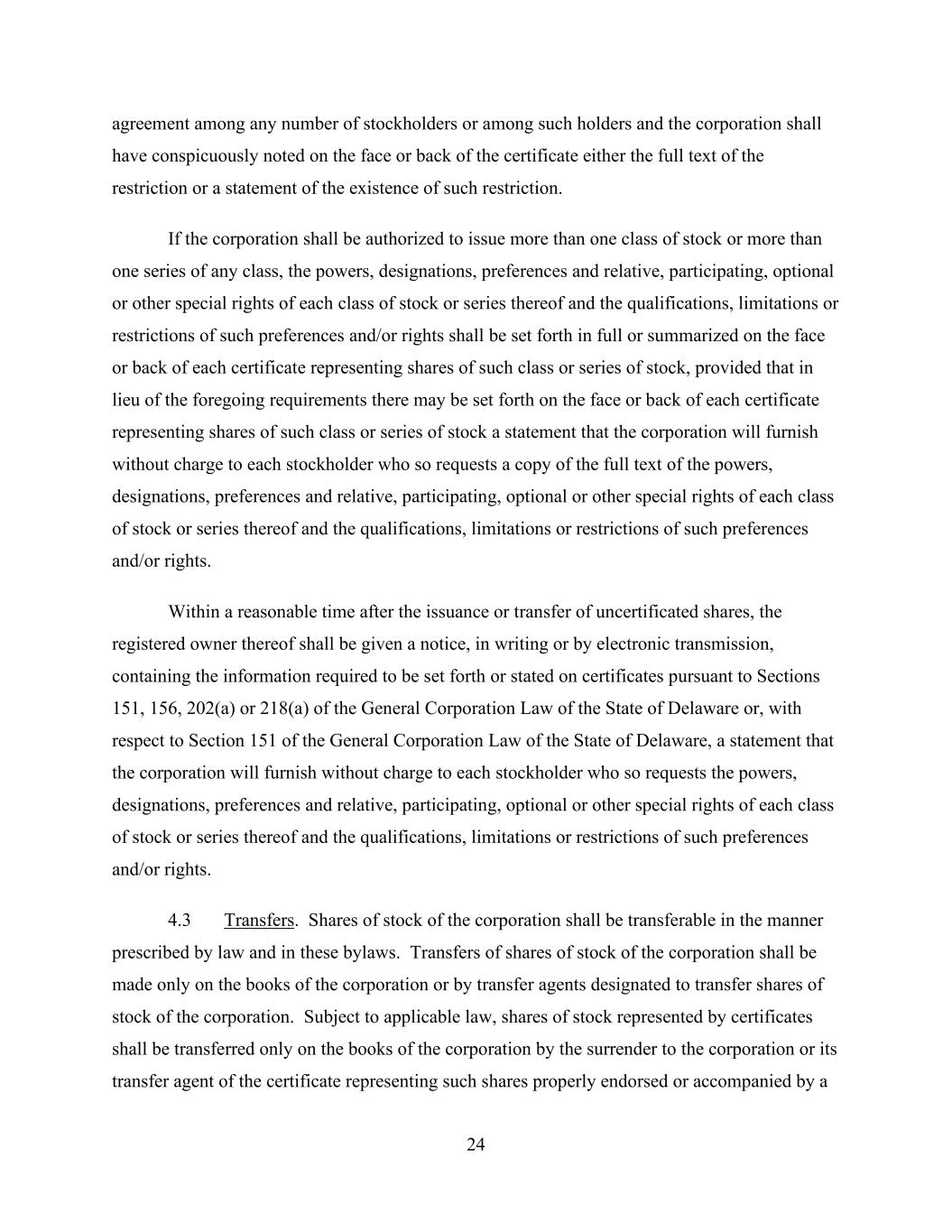 24 agreement among any number of stockholders or among such holders and the corporation shall have conspicuously noted on the face or back of the certificate either the full text of the restriction or a statement of the existence of such restriction. If the corporation shall be authorized to issue more than one class of stock or more than one series of any class, the powers, designations, preferences and relative, participating, optional or other special rights of each class of stock or series thereof and the qualifications, limitations or restrictions of such preferences and/or rights shall be set forth in full or summarized on the face or back of each certificate representing shares of such class or series of stock, provided that in lieu of the foregoing requirements there may be set forth on the face or back of each certificate representing shares of such class or series of stock a statement that the corporation will furnish without charge to each stockholder who so requests a copy of the full text of the powers, designations, preferences and relative, participating, optional or other special rights of each class of stock or series thereof and the qualifications, limitations or restrictions of such preferences and/or rights. Within a reasonable time after the issuance or transfer of uncertificated shares, the registered owner thereof shall be given a notice, in writing or by electronic transmission, containing the information required to be set forth or stated on certificates pursuant to Sections 151, 156, 202(a) or 218(a) of the General Corporation Law of the State of Delaware or, with respect to Section 151 of the General Corporation Law of the State of Delaware, a statement that the corporation will furnish without charge to each stockholder who so requests the powers, designations, preferences and relative, participating, optional or other special rights of each class of stock or series thereof and the qualifications, limitations or restrictions of such preferences and/or rights. 4.3 Transfers. Shares of stock of the corporation shall be transferable in the manner prescribed by law and in these bylaws. Transfers of shares of stock of the corporation shall be made only on the books of the corporation or by transfer agents designated to transfer shares of stock of the corporation. Subject to applicable law, shares of stock represented by certificates shall be transferred only on the books of the corporation by the surrender to the corporation or its transfer agent of the certificate representing such shares properly endorsed or accompanied by a
