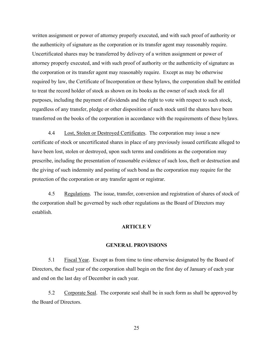 25 written assignment or power of attorney properly executed, and with such proof of authority or the authenticity of signature as the corporation or its transfer agent may reasonably require. Uncertificated shares may be transferred by delivery of a written assignment or power of attorney properly executed, and with such proof of authority or the authenticity of signature as the corporation or its transfer agent may reasonably require. Except as may be otherwise required by law, the Certificate of Incorporation or these bylaws, the corporation shall be entitled to treat the record holder of stock as shown on its books as the owner of such stock for all purposes, including the payment of dividends and the right to vote with respect to such stock, regardless of any transfer, pledge or other disposition of such stock until the shares have been transferred on the books of the corporation in accordance with the requirements of these bylaws. 4.4 Lost, Stolen or Destroyed Certificates. The corporation may issue a new certificate of stock or uncertificated shares in place of any previously issued certificate alleged to have been lost, stolen or destroyed, upon such terms and conditions as the corporation may prescribe, including the presentation of reasonable evidence of such loss, theft or destruction and the giving of such indemnity and posting of such bond as the corporation may require for the protection of the corporation or any transfer agent or registrar. 4.5 Regulations. The issue, transfer, conversion and registration of shares of stock of the corporation shall be governed by such other regulations as the Board of Directors may establish. ARTICLE V GENERAL PROVISIONS 5.1 Fiscal Year. Except as from time to time otherwise designated by the Board of Directors, the fiscal year of the corporation shall begin on the first day of January of each year and end on the last day of December in each year. 5.2 Corporate Seal. The corporate seal shall be in such form as shall be approved by the Board of Directors.