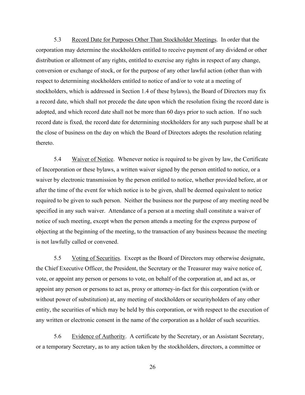 26 5.3 Record Date for Purposes Other Than Stockholder Meetings. In order that the corporation may determine the stockholders entitled to receive payment of any dividend or other distribution or allotment of any rights, entitled to exercise any rights in respect of any change, conversion or exchange of stock, or for the purpose of any other lawful action (other than with respect to determining stockholders entitled to notice of and/or to vote at a meeting of stockholders, which is addressed in Section 1.4 of these bylaws), the Board of Directors may fix a record date, which shall not precede the date upon which the resolution fixing the record date is adopted, and which record date shall not be more than 60 days prior to such action. If no such record date is fixed, the record date for determining stockholders for any such purpose shall be at the close of business on the day on which the Board of Directors adopts the resolution relating thereto. 5.4 Waiver of Notice. Whenever notice is required to be given by law, the Certificate of Incorporation or these bylaws, a written waiver signed by the person entitled to notice, or a waiver by electronic transmission by the person entitled to notice, whether provided before, at or after the time of the event for which notice is to be given, shall be deemed equivalent to notice required to be given to such person. Neither the business nor the purpose of any meeting need be specified in any such waiver. Attendance of a person at a meeting shall constitute a waiver of notice of such meeting, except when the person attends a meeting for the express purpose of objecting at the beginning of the meeting, to the transaction of any business because the meeting is not lawfully called or convened. 5.5 Voting of Securities. Except as the Board of Directors may otherwise designate, the Chief Executive Officer, the President, the Secretary or the Treasurer may waive notice of, vote, or appoint any person or persons to vote, on behalf of the corporation at, and act as, or appoint any person or persons to act as, proxy or attorney-in-fact for this corporation (with or without power of substitution) at, any meeting of stockholders or securityholders of any other entity, the securities of which may be held by this corporation, or with respect to the execution of any written or electronic consent in the name of the corporation as a holder of such securities. 5.6 Evidence of Authority. A certificate by the Secretary, or an Assistant Secretary, or a temporary Secretary, as to any action taken by the stockholders, directors, a committee or