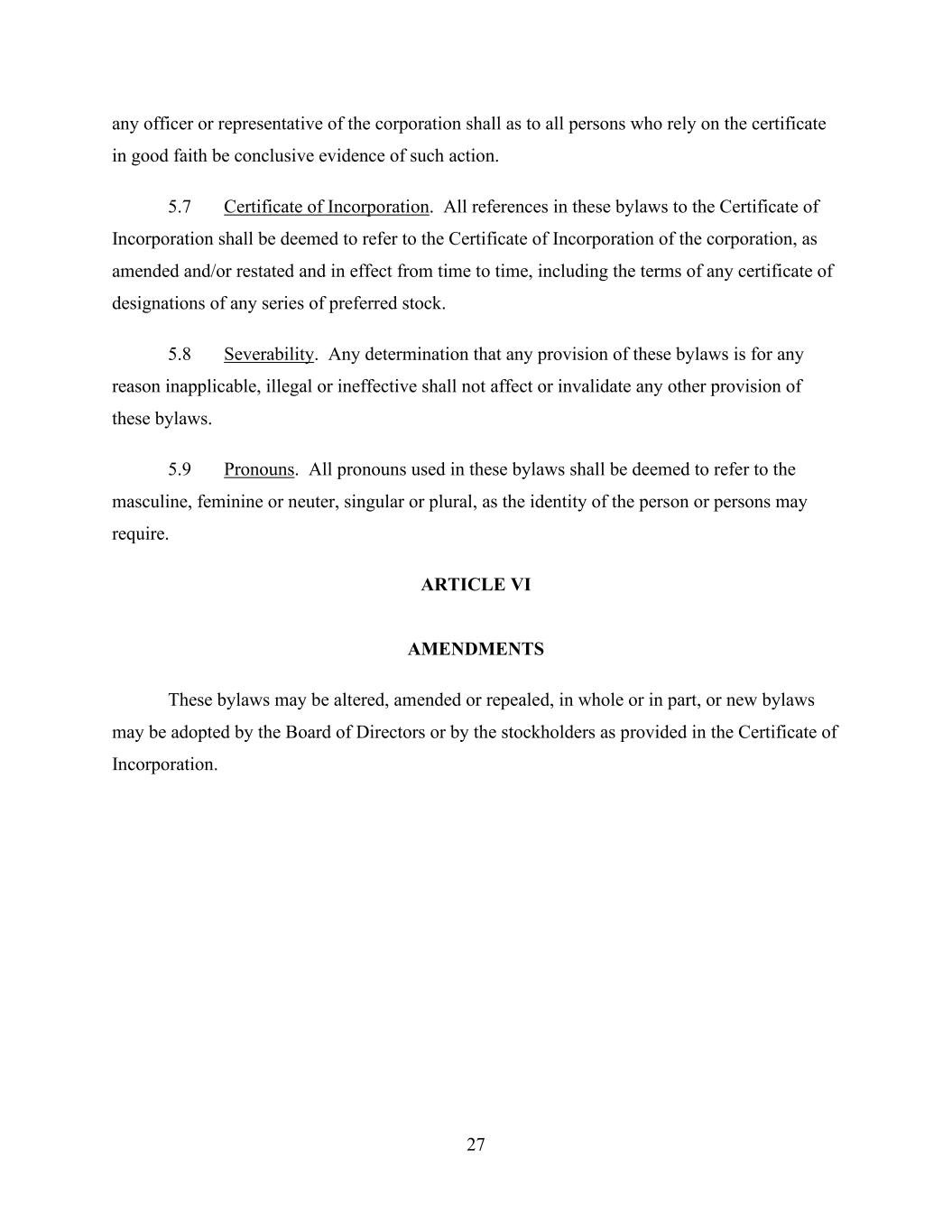 27 any officer or representative of the corporation shall as to all persons who rely on the certificate in good faith be conclusive evidence of such action. 5.7 Certificate of Incorporation. All references in these bylaws to the Certificate of Incorporation shall be deemed to refer to the Certificate of Incorporation of the corporation, as amended and/or restated and in effect from time to time, including the terms of any certificate of designations of any series of preferred stock. 5.8 Severability. Any determination that any provision of these bylaws is for any reason inapplicable, illegal or ineffective shall not affect or invalidate any other provision of these bylaws. 5.9 Pronouns. All pronouns used in these bylaws shall be deemed to refer to the masculine, feminine or neuter, singular or plural, as the identity of the person or persons may require. ARTICLE VI AMENDMENTS These bylaws may be altered, amended or repealed, in whole or in part, or new bylaws may be adopted by the Board of Directors or by the stockholders as provided in the Certificate of Incorporation.