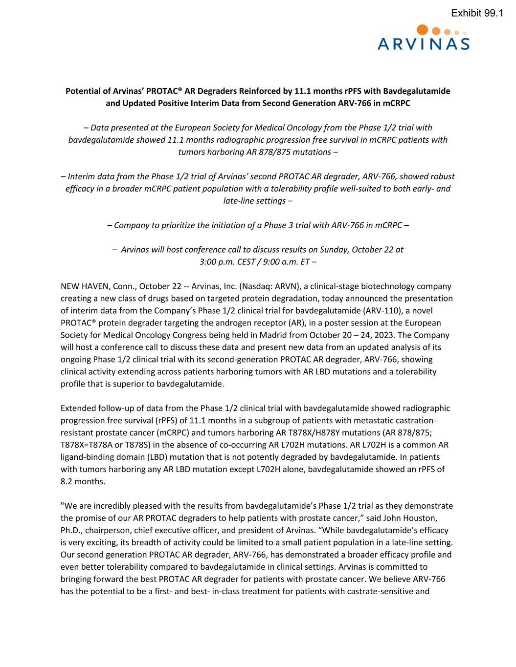 Potential of Arvinas’ PROTAC® AR Degraders Reinforced by 11.1 months rPFS with Bavdegalutamide and Updated Positive Interim Data from Second Generation ARV-766 in mCRPC – Data presented at the European Society for Medical Oncology from the Phase 1/2 trial with bavdegalutamide showed 11.1 months radiographic progression free survival in mCRPC patients with tumors harboring AR 878/875 mutations – – Interim data from the Phase 1/2 trial of Arvinas’ second PROTAC AR degrader, ARV-766, showed robust efficacy in a broader mCRPC patient population with a tolerability profile well-suited to both early- and late-line settings – – Company to prioritize the initiation of a Phase 3 trial with ARV-766 in mCRPC – – Arvinas will host conference call to discuss results on Sunday, October 22 at 3:00 p.m. CEST / 9:00 a.m. ET – NEW HAVEN, Conn., October 22 -- Arvinas, Inc. (Nasdaq: ARVN), a clinical-stage biotechnology company creating a new class of drugs based on targeted protein degradation, today announced the presentation of interim data from the Company’s Phase 1/2 clinical trial for bavdegalutamide (ARV-110), a novel PROTAC® protein degrader targeting the androgen receptor (AR), in a poster session at the European Society for Medical Oncology Congress being held in Madrid from October 20 – 24, 2023. The Company will host a conference call to discuss these data and present new data from an updated analysis of its ongoing Phase 1/2 clinical trial with its second-generation PROTAC AR degrader, ARV-766, showing clinical activity extending across patients harboring tumors with AR LBD mutations and a tolerability profile that is superior to bavdegalutamide. Extended follow-up of data from the Phase 1/2 clinical trial with bavdegalutamide showed radiographic progression free survival (rPFS) of 11.1 months in a subgroup of patients with metastatic castration- resistant prostate cancer (mCRPC) and tumors harboring AR T878X/H878Y mutations (AR 878/875; T878X=T878A or T878S) in the absence of co-occurring AR L702H mutations. AR L702H is a common AR ligand-binding domain (LBD) mutation that is not potently degraded by bavdegalutamide. In patients with tumors harboring any AR LBD mutation except L702H alone, bavdegalutamide showed an rPFS of 8.2 months. "We are incredibly pleased with the results from bavdegalutamide’s Phase 1/2 trial as they demonstrate the promise of our AR PROTAC degraders to help patients with prostate cancer,” said John Houston, Ph.D., chairperson, chief executive officer, and president of Arvinas. “While bavdegalutamide’s efficacy is very exciting, its breadth of activity could be limited to a small patient population in a late-line setting. Our second generation PROTAC AR degrader, ARV-766, has demonstrated a broader efficacy profile and even better tolerability compared to bavdegalutamide in clinical settings. Arvinas is committed to bringing forward the best PROTAC AR degrader for patients with prostate cancer. We believe ARV-766 has the potential to be a first- and best- in-class treatment for patients with castrate-sensitive and Exhibit 99.1
