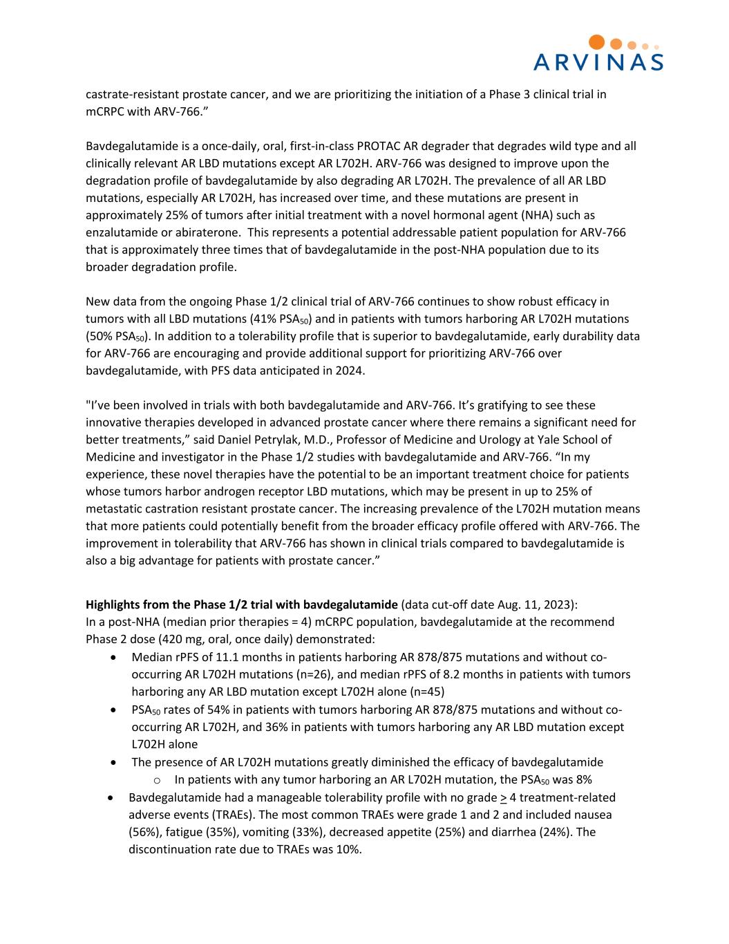 castrate-resistant prostate cancer, and we are prioritizing the initiation of a Phase 3 clinical trial in mCRPC with ARV-766.” Bavdegalutamide is a once-daily, oral, first-in-class PROTAC AR degrader that degrades wild type and all clinically relevant AR LBD mutations except AR L702H. ARV-766 was designed to improve upon the degradation profile of bavdegalutamide by also degrading AR L702H. The prevalence of all AR LBD mutations, especially AR L702H, has increased over time, and these mutations are present in approximately 25% of tumors after initial treatment with a novel hormonal agent (NHA) such as enzalutamide or abiraterone. This represents a potential addressable patient population for ARV-766 that is approximately three times that of bavdegalutamide in the post-NHA population due to its broader degradation profile. New data from the ongoing Phase 1/2 clinical trial of ARV-766 continues to show robust efficacy in tumors with all LBD mutations (41% PSA50) and in patients with tumors harboring AR L702H mutations (50% PSA50). In addition to a tolerability profile that is superior to bavdegalutamide, early durability data for ARV-766 are encouraging and provide additional support for prioritizing ARV-766 over bavdegalutamide, with PFS data anticipated in 2024. "I’ve been involved in trials with both bavdegalutamide and ARV-766. It’s gratifying to see these innovative therapies developed in advanced prostate cancer where there remains a significant need for better treatments,” said Daniel Petrylak, M.D., Professor of Medicine and Urology at Yale School of Medicine and investigator in the Phase 1/2 studies with bavdegalutamide and ARV-766. “In my experience, these novel therapies have the potential to be an important treatment choice for patients whose tumors harbor androgen receptor LBD mutations, which may be present in up to 25% of metastatic castration resistant prostate cancer. The increasing prevalence of the L702H mutation means that more patients could potentially benefit from the broader efficacy profile offered with ARV-766. The improvement in tolerability that ARV-766 has shown in clinical trials compared to bavdegalutamide is also a big advantage for patients with prostate cancer.” Highlights from the Phase 1/2 trial with bavdegalutamide (data cut-off date Aug. 11, 2023): In a post-NHA (median prior therapies = 4) mCRPC population, bavdegalutamide at the recommend Phase 2 dose (420 mg, oral, once daily) demonstrated: • Median rPFS of 11.1 months in patients harboring AR 878/875 mutations and without co- occurring AR L702H mutations (n=26), and median rPFS of 8.2 months in patients with tumors harboring any AR LBD mutation except L702H alone (n=45) • PSA50 rates of 54% in patients with tumors harboring AR 878/875 mutations and without co- occurring AR L702H, and 36% in patients with tumors harboring any AR LBD mutation except L702H alone • The presence of AR L702H mutations greatly diminished the efficacy of bavdegalutamide o In patients with any tumor harboring an AR L702H mutation, the PSA50 was 8% • Bavdegalutamide had a manageable tolerability profile with no grade > 4 treatment-related adverse events (TRAEs). The most common TRAEs were grade 1 and 2 and included nausea (56%), fatigue (35%), vomiting (33%), decreased appetite (25%) and diarrhea (24%). The discontinuation rate due to TRAEs was 10%.