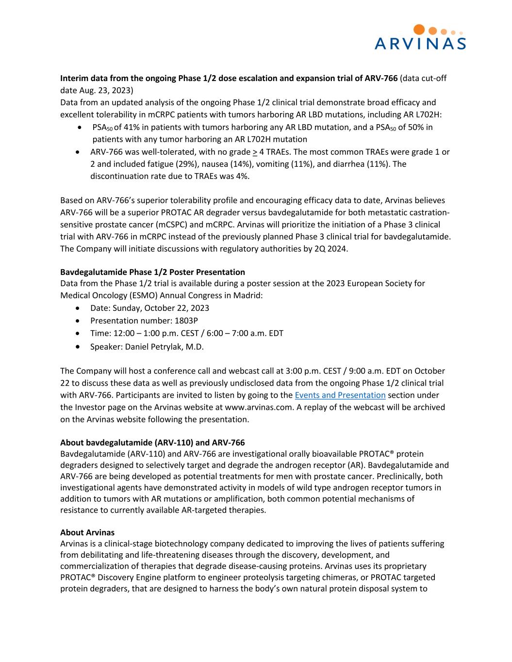 Interim data from the ongoing Phase 1/2 dose escalation and expansion trial of ARV-766 (data cut-off date Aug. 23, 2023) Data from an updated analysis of the ongoing Phase 1/2 clinical trial demonstrate broad efficacy and excellent tolerability in mCRPC patients with tumors harboring AR LBD mutations, including AR L702H: • PSA50 of 41% in patients with tumors harboring any AR LBD mutation, and a PSA50 of 50% in patients with any tumor harboring an AR L702H mutation • ARV-766 was well-tolerated, with no grade > 4 TRAEs. The most common TRAEs were grade 1 or 2 and included fatigue (29%), nausea (14%), vomiting (11%), and diarrhea (11%). The discontinuation rate due to TRAEs was 4%. Based on ARV-766’s superior tolerability profile and encouraging efficacy data to date, Arvinas believes ARV-766 will be a superior PROTAC AR degrader versus bavdegalutamide for both metastatic castration- sensitive prostate cancer (mCSPC) and mCRPC. Arvinas will prioritize the initiation of a Phase 3 clinical trial with ARV-766 in mCRPC instead of the previously planned Phase 3 clinical trial for bavdegalutamide. The Company will initiate discussions with regulatory authorities by 2Q 2024. Bavdegalutamide Phase 1/2 Poster Presentation Data from the Phase 1/2 trial is available during a poster session at the 2023 European Society for Medical Oncology (ESMO) Annual Congress in Madrid: • Date: Sunday, October 22, 2023 • Presentation number: 1803P • Time: 12:00 – 1:00 p.m. CEST / 6:00 – 7:00 a.m. EDT • Speaker: Daniel Petrylak, M.D. The Company will host a conference call and webcast call at 3:00 p.m. CEST / 9:00 a.m. EDT on October 22 to discuss these data as well as previously undisclosed data from the ongoing Phase 1/2 clinical trial with ARV-766. Participants are invited to listen by going to the Events and Presentation section under the Investor page on the Arvinas website at www.arvinas.com. A replay of the webcast will be archived on the Arvinas website following the presentation. About bavdegalutamide (ARV-110) and ARV-766 Bavdegalutamide (ARV-110) and ARV-766 are investigational orally bioavailable PROTAC® protein degraders designed to selectively target and degrade the androgen receptor (AR). Bavdegalutamide and ARV-766 are being developed as potential treatments for men with prostate cancer. Preclinically, both investigational agents have demonstrated activity in models of wild type androgen receptor tumors in addition to tumors with AR mutations or amplification, both common potential mechanisms of resistance to currently available AR-targeted therapies. About Arvinas Arvinas is a clinical-stage biotechnology company dedicated to improving the lives of patients suffering from debilitating and life-threatening diseases through the discovery, development, and commercialization of therapies that degrade disease-causing proteins. Arvinas uses its proprietary PROTAC® Discovery Engine platform to engineer proteolysis targeting chimeras, or PROTAC targeted protein degraders, that are designed to harness the body’s own natural protein disposal system to