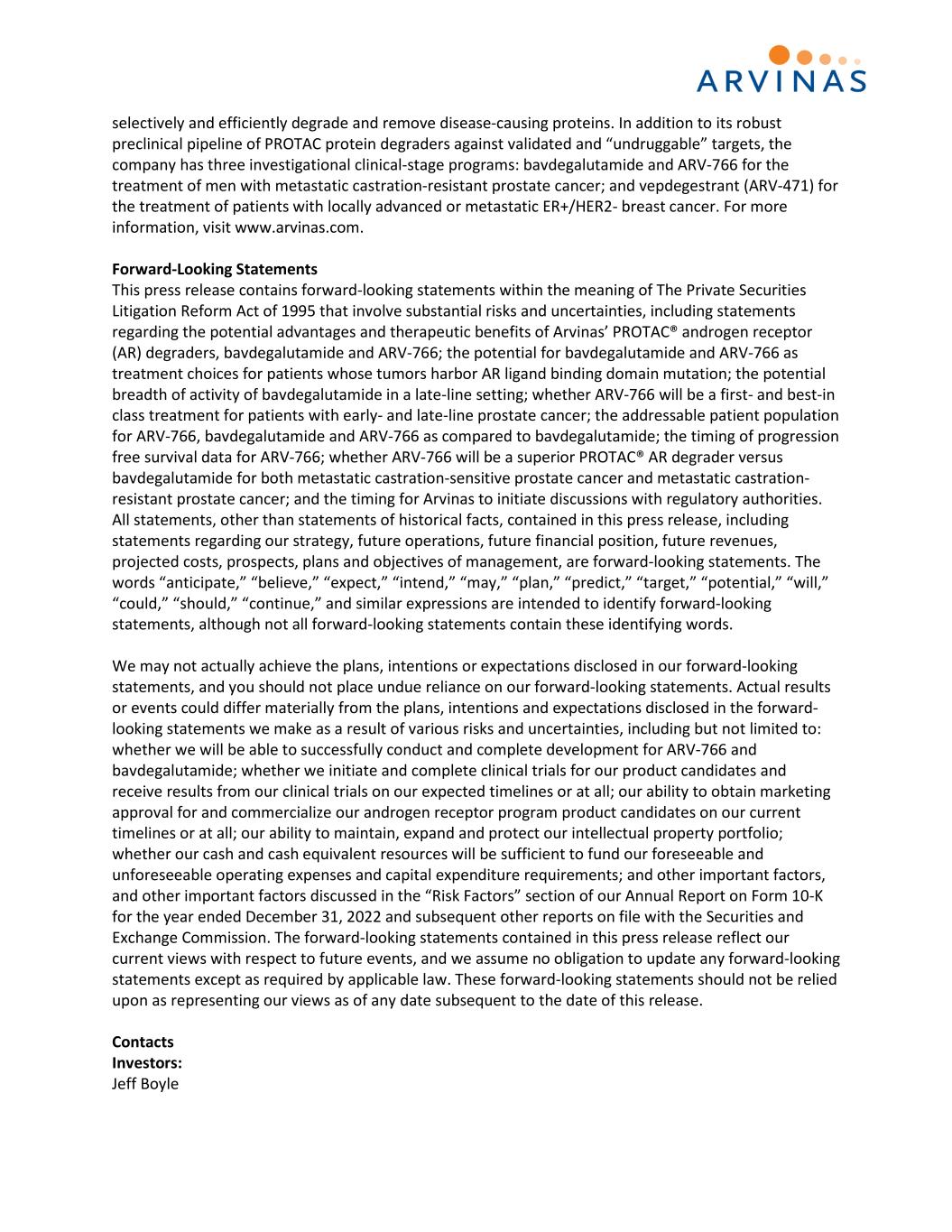 selectively and efficiently degrade and remove disease-causing proteins. In addition to its robust preclinical pipeline of PROTAC protein degraders against validated and “undruggable” targets, the company has three investigational clinical-stage programs: bavdegalutamide and ARV-766 for the treatment of men with metastatic castration-resistant prostate cancer; and vepdegestrant (ARV-471) for the treatment of patients with locally advanced or metastatic ER+/HER2- breast cancer. For more information, visit www.arvinas.com. Forward-Looking Statements This press release contains forward-looking statements within the meaning of The Private Securities Litigation Reform Act of 1995 that involve substantial risks and uncertainties, including statements regarding the potential advantages and therapeutic benefits of Arvinas’ PROTAC® androgen receptor (AR) degraders, bavdegalutamide and ARV-766; the potential for bavdegalutamide and ARV-766 as treatment choices for patients whose tumors harbor AR ligand binding domain mutation; the potential breadth of activity of bavdegalutamide in a late-line setting; whether ARV-766 will be a first- and best-in class treatment for patients with early- and late-line prostate cancer; the addressable patient population for ARV-766, bavdegalutamide and ARV-766 as compared to bavdegalutamide; the timing of progression free survival data for ARV-766; whether ARV-766 will be a superior PROTAC® AR degrader versus bavdegalutamide for both metastatic castration-sensitive prostate cancer and metastatic castration- resistant prostate cancer; and the timing for Arvinas to initiate discussions with regulatory authorities. All statements, other than statements of historical facts, contained in this press release, including statements regarding our strategy, future operations, future financial position, future revenues, projected costs, prospects, plans and objectives of management, are forward-looking statements. The words “anticipate,” “believe,” “expect,” “intend,” “may,” “plan,” “predict,” “target,” “potential,” “will,” “could,” “should,” “continue,” and similar expressions are intended to identify forward-looking statements, although not all forward-looking statements contain these identifying words. We may not actually achieve the plans, intentions or expectations disclosed in our forward-looking statements, and you should not place undue reliance on our forward-looking statements. Actual results or events could differ materially from the plans, intentions and expectations disclosed in the forward- looking statements we make as a result of various risks and uncertainties, including but not limited to: whether we will be able to successfully conduct and complete development for ARV-766 and bavdegalutamide; whether we initiate and complete clinical trials for our product candidates and receive results from our clinical trials on our expected timelines or at all; our ability to obtain marketing approval for and commercialize our androgen receptor program product candidates on our current timelines or at all; our ability to maintain, expand and protect our intellectual property portfolio; whether our cash and cash equivalent resources will be sufficient to fund our foreseeable and unforeseeable operating expenses and capital expenditure requirements; and other important factors, and other important factors discussed in the “Risk Factors” section of our Annual Report on Form 10-K for the year ended December 31, 2022 and subsequent other reports on file with the Securities and Exchange Commission. The forward-looking statements contained in this press release reflect our current views with respect to future events, and we assume no obligation to update any forward-looking statements except as required by applicable law. These forward-looking statements should not be relied upon as representing our views as of any date subsequent to the date of this release. Contacts Investors: Jeff Boyle