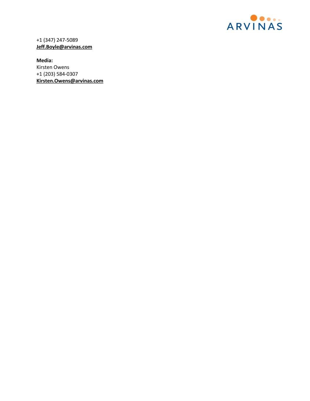 +1 (347) 247-5089 Jeff.Boyle@arvinas.com Media: Kirsten Owens +1 (203) 584-0307 Kirsten.Owens@arvinas.com