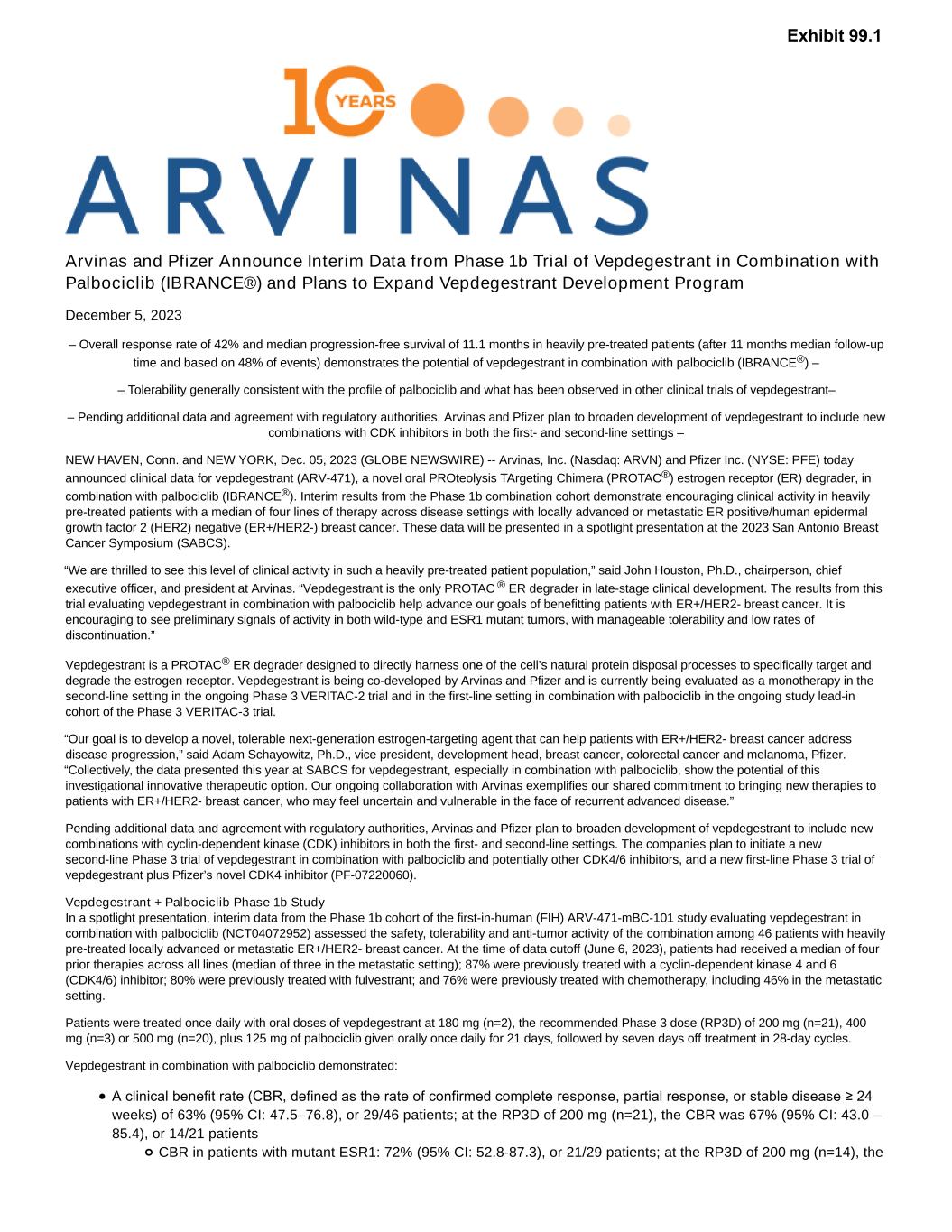 Arvinas and Pfizer Announce Interim Data from Phase 1b Trial of Vepdegestrant in Combination with Palbociclib (IBRANCE®) and Plans to Expand Vepdegestrant Development Program December 5, 2023 – Overall response rate of 42% and median progression-free survival of 11.1 months in heavily pre-treated patients (after 11 months median follow-up time and based on 48% of events) demonstrates the potential of vepdegestrant in combination with palbociclib (IBRANCE®) – – Tolerability generally consistent with the profile of palbociclib and what has been observed in other clinical trials of vepdegestrant– – Pending additional data and agreement with regulatory authorities, Arvinas and Pfizer plan to broaden development of vepdegestrant to include new combinations with CDK inhibitors in both the first- and second-line settings – NEW HAVEN, Conn. and NEW YORK, Dec. 05, 2023 (GLOBE NEWSWIRE) -- Arvinas, Inc. (Nasdaq: ARVN) and Pfizer Inc. (NYSE: PFE) today announced clinical data for vepdegestrant (ARV-471), a novel oral PROteolysis TArgeting Chimera (PROTAC®) estrogen receptor (ER) degrader, in combination with palbociclib (IBRANCE®). Interim results from the Phase 1b combination cohort demonstrate encouraging clinical activity in heavily pre-treated patients with a median of four lines of therapy across disease settings with locally advanced or metastatic ER positive/human epidermal growth factor 2 (HER2) negative (ER+/HER2-) breast cancer. These data will be presented in a spotlight presentation at the 2023 San Antonio Breast Cancer Symposium (SABCS). “We are thrilled to see this level of clinical activity in such a heavily pre-treated patient population,” said John Houston, Ph.D., chairperson, chief executive officer, and president at Arvinas. “Vepdegestrant is the only PROTAC ® ER degrader in late-stage clinical development. The results from this trial evaluating vepdegestrant in combination with palbociclib help advance our goals of benefitting patients with ER+/HER2- breast cancer. It is encouraging to see preliminary signals of activity in both wild-type and ESR1 mutant tumors, with manageable tolerability and low rates of discontinuation.” Vepdegestrant is a PROTAC® ER degrader designed to directly harness one of the cell’s natural protein disposal processes to specifically target and degrade the estrogen receptor. Vepdegestrant is being co-developed by Arvinas and Pfizer and is currently being evaluated as a monotherapy in the second-line setting in the ongoing Phase 3 VERITAC-2 trial and in the first-line setting in combination with palbociclib in the ongoing study lead-in cohort of the Phase 3 VERITAC-3 trial. “Our goal is to develop a novel, tolerable next-generation estrogen-targeting agent that can help patients with ER+/HER2- breast cancer address disease progression,” said Adam Schayowitz, Ph.D., vice president, development head, breast cancer, colorectal cancer and melanoma, Pfizer. “Collectively, the data presented this year at SABCS for vepdegestrant, especially in combination with palbociclib, show the potential of this investigational innovative therapeutic option. Our ongoing collaboration with Arvinas exemplifies our shared commitment to bringing new therapies to patients with ER+/HER2- breast cancer, who may feel uncertain and vulnerable in the face of recurrent advanced disease.” Pending additional data and agreement with regulatory authorities, Arvinas and Pfizer plan to broaden development of vepdegestrant to include new combinations with cyclin-dependent kinase (CDK) inhibitors in both the first- and second-line settings. The companies plan to initiate a new second-line Phase 3 trial of vepdegestrant in combination with palbociclib and potentially other CDK4/6 inhibitors, and a new first-line Phase 3 trial of vepdegestrant plus Pfizer’s novel CDK4 inhibitor (PF-07220060). Vepdegestrant + Palbociclib Phase 1b Study In a spotlight presentation, interim data from the Phase 1b cohort of the first-in-human (FIH) ARV-471-mBC-101 study evaluating vepdegestrant in combination with palbociclib (NCT04072952) assessed the safety, tolerability and anti-tumor activity of the combination among 46 patients with heavily pre-treated locally advanced or metastatic ER+/HER2- breast cancer. At the time of data cutoff (June 6, 2023), patients had received a median of four prior therapies across all lines (median of three in the metastatic setting); 87% were previously treated with a cyclin-dependent kinase 4 and 6 (CDK4/6) inhibitor; 80% were previously treated with fulvestrant; and 76% were previously treated with chemotherapy, including 46% in the metastatic setting. Patients were treated once daily with oral doses of vepdegestrant at 180 mg (n=2), the recommended Phase 3 dose (RP3D) of 200 mg (n=21), 400 mg (n=3) or 500 mg (n=20), plus 125 mg of palbociclib given orally once daily for 21 days, followed by seven days off treatment in 28-day cycles. Vepdegestrant in combination with palbociclib demonstrated: A clinical benefit rate (CBR, defined as the rate of confirmed complete response, partial response, or stable disease ≥ 24 weeks) of 63% (95% CI: 47.5–76.8), or 29/46 patients; at the RP3D of 200 mg (n=21), the CBR was 67% (95% CI: 43.0 – 85.4), or 14/21 patients CBR in patients with mutant ESR1: 72% (95% CI: 52.8-87.3), or 21/29 patients; at the RP3D of 200 mg (n=14), the E Exhibit 99.1