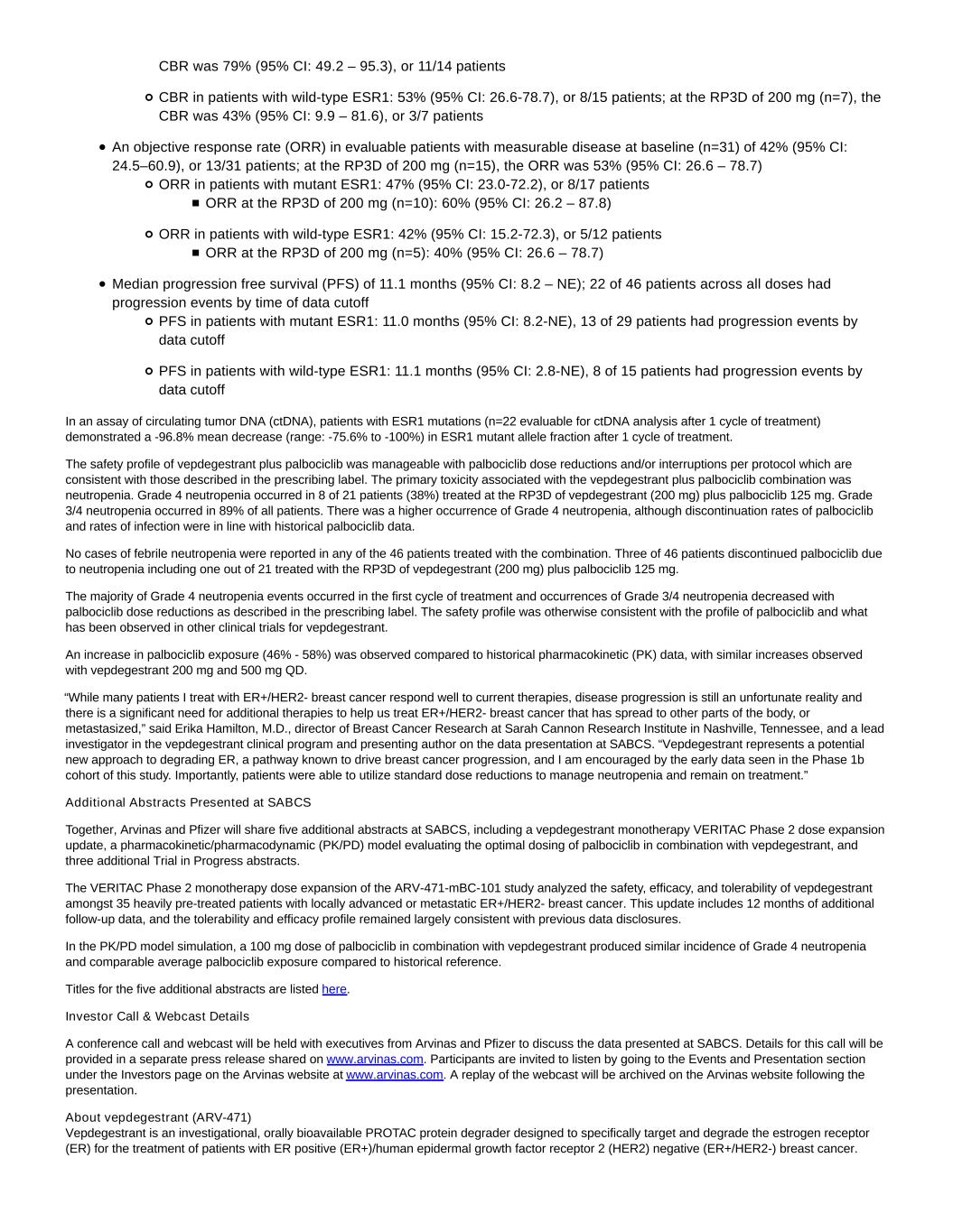 CBR was 79% (95% CI: 49.2 – 95.3), or 11/14 patients CBR in patients with wild-type ESR1: 53% (95% CI: 26.6-78.7), or 8/15 patients; at the RP3D of 200 mg (n=7), the CBR was 43% (95% CI: 9.9 – 81.6), or 3/7 patients An objective response rate (ORR) in evaluable patients with measurable disease at baseline (n=31) of 42% (95% CI: 24.5–60.9), or 13/31 patients; at the RP3D of 200 mg (n=15), the ORR was 53% (95% CI: 26.6 – 78.7) ORR in patients with mutant ESR1: 47% (95% CI: 23.0-72.2), or 8/17 patients ORR at the RP3D of 200 mg (n=10): 60% (95% CI: 26.2 – 87.8) ORR in patients with wild-type ESR1: 42% (95% CI: 15.2-72.3), or 5/12 patients ORR at the RP3D of 200 mg (n=5): 40% (95% CI: 26.6 – 78.7) Median progression free survival (PFS) of 11.1 months (95% CI: 8.2 – NE); 22 of 46 patients across all doses had progression events by time of data cutoff PFS in patients with mutant ESR1: 11.0 months (95% CI: 8.2-NE), 13 of 29 patients had progression events by data cutoff PFS in patients with wild-type ESR1: 11.1 months (95% CI: 2.8-NE), 8 of 15 patients had progression events by data cutoff In an assay of circulating tumor DNA (ctDNA), patients with ESR1 mutations (n=22 evaluable for ctDNA analysis after 1 cycle of treatment) demonstrated a -96.8% mean decrease (range: -75.6% to -100%) in ESR1 mutant allele fraction after 1 cycle of treatment. The safety profile of vepdegestrant plus palbociclib was manageable with palbociclib dose reductions and/or interruptions per protocol which are consistent with those described in the prescribing label. The primary toxicity associated with the vepdegestrant plus palbociclib combination was neutropenia. Grade 4 neutropenia occurred in 8 of 21 patients (38%) treated at the RP3D of vepdegestrant (200 mg) plus palbociclib 125 mg. Grade 3/4 neutropenia occurred in 89% of all patients. There was a higher occurrence of Grade 4 neutropenia, although discontinuation rates of palbociclib and rates of infection were in line with historical palbociclib data. No cases of febrile neutropenia were reported in any of the 46 patients treated with the combination. Three of 46 patients discontinued palbociclib due to neutropenia including one out of 21 treated with the RP3D of vepdegestrant (200 mg) plus palbociclib 125 mg. The majority of Grade 4 neutropenia events occurred in the first cycle of treatment and occurrences of Grade 3/4 neutropenia decreased with palbociclib dose reductions as described in the prescribing label. The safety profile was otherwise consistent with the profile of palbociclib and what has been observed in other clinical trials for vepdegestrant. An increase in palbociclib exposure (46% - 58%) was observed compared to historical pharmacokinetic (PK) data, with similar increases observed with vepdegestrant 200 mg and 500 mg QD. “While many patients I treat with ER+/HER2- breast cancer respond well to current therapies, disease progression is still an unfortunate reality and there is a significant need for additional therapies to help us treat ER+/HER2- breast cancer that has spread to other parts of the body, or metastasized,” said Erika Hamilton, M.D., director of Breast Cancer Research at Sarah Cannon Research Institute in Nashville, Tennessee, and a lead investigator in the vepdegestrant clinical program and presenting author on the data presentation at SABCS. “Vepdegestrant represents a potential new approach to degrading ER, a pathway known to drive breast cancer progression, and I am encouraged by the early data seen in the Phase 1b cohort of this study. Importantly, patients were able to utilize standard dose reductions to manage neutropenia and remain on treatment.” Additional Abstracts Presented at SABCS Together, Arvinas and Pfizer will share five additional abstracts at SABCS, including a vepdegestrant monotherapy VERITAC Phase 2 dose expansion update, a pharmacokinetic/pharmacodynamic (PK/PD) model evaluating the optimal dosing of palbociclib in combination with vepdegestrant, and three additional Trial in Progress abstracts. The VERITAC Phase 2 monotherapy dose expansion of the ARV-471-mBC-101 study analyzed the safety, efficacy, and tolerability of vepdegestrant amongst 35 heavily pre-treated patients with locally advanced or metastatic ER+/HER2- breast cancer. This update includes 12 months of additional follow-up data, and the tolerability and efficacy profile remained largely consistent with previous data disclosures. In the PK/PD model simulation, a 100 mg dose of palbociclib in combination with vepdegestrant produced similar incidence of Grade 4 neutropenia and comparable average palbociclib exposure compared to historical reference. Titles for the five additional abstracts are listed here. Investor Call & Webcast Details A conference call and webcast will be held with executives from Arvinas and Pfizer to discuss the data presented at SABCS. Details for this call will be provided in a separate press release shared on www.arvinas.com. Participants are invited to listen by going to the Events and Presentation section under the Investors page on the Arvinas website at www.arvinas.com. A replay of the webcast will be archived on the Arvinas website following the presentation. About vepdegestrant (ARV-471) Vepdegestrant is an investigational, orally bioavailable PROTAC protein degrader designed to specifically target and degrade the estrogen receptor (ER) for the treatment of patients with ER positive (ER+)/human epidermal growth factor receptor 2 (HER2) negative (ER+/HER2-) breast cancer.