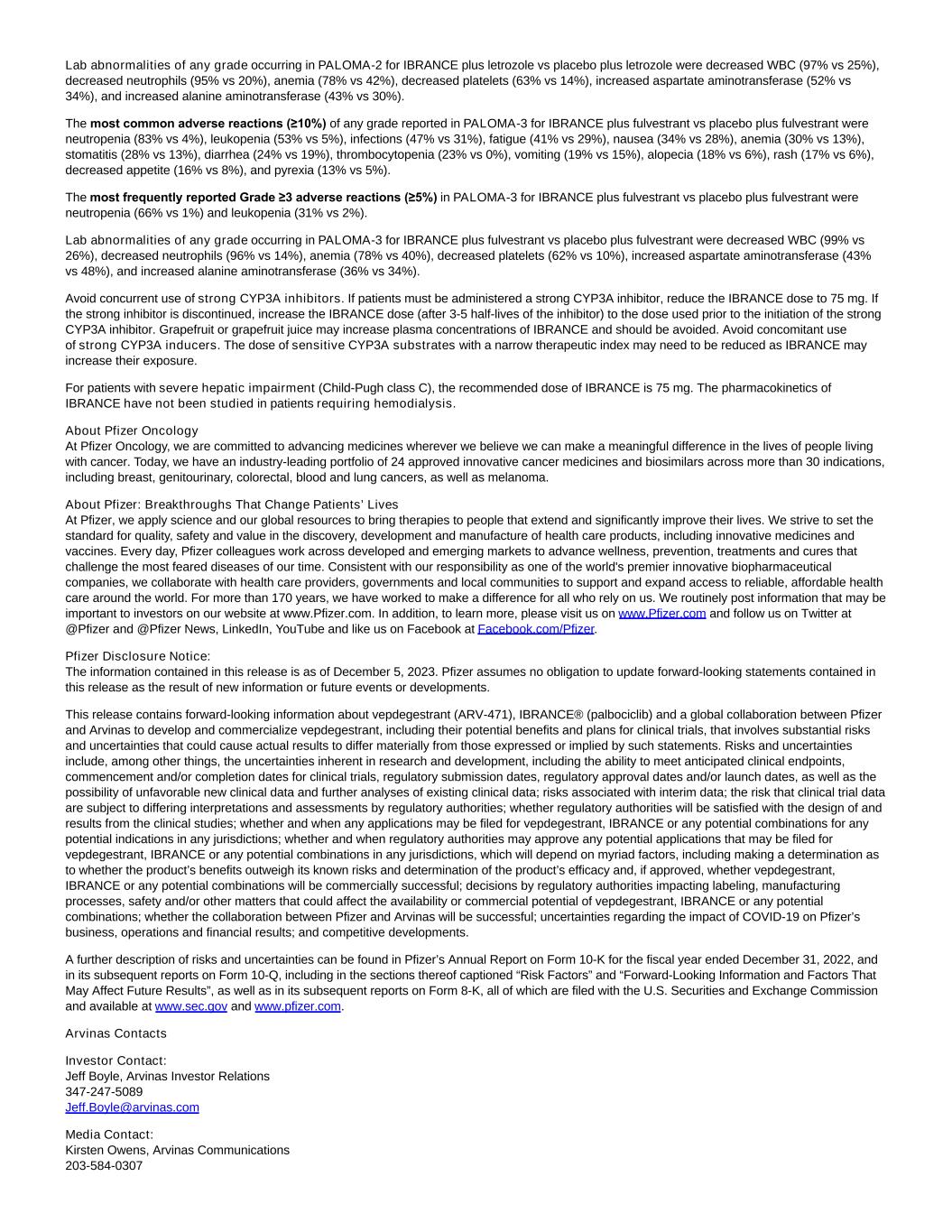 Lab abnormalities of any grade occurring in PALOMA-2 for IBRANCE plus letrozole vs placebo plus letrozole were decreased WBC (97% vs 25%), decreased neutrophils (95% vs 20%), anemia (78% vs 42%), decreased platelets (63% vs 14%), increased aspartate aminotransferase (52% vs 34%), and increased alanine aminotransferase (43% vs 30%). The most common adverse reactions (≥10%) of any grade reported in PALOMA-3 for IBRANCE plus fulvestrant vs placebo plus fulvestrant were neutropenia (83% vs 4%), leukopenia (53% vs 5%), infections (47% vs 31%), fatigue (41% vs 29%), nausea (34% vs 28%), anemia (30% vs 13%), stomatitis (28% vs 13%), diarrhea (24% vs 19%), thrombocytopenia (23% vs 0%), vomiting (19% vs 15%), alopecia (18% vs 6%), rash (17% vs 6%), decreased appetite (16% vs 8%), and pyrexia (13% vs 5%). The most frequently reported Grade ≥3 adverse reactions (≥5%) in PALOMA-3 for IBRANCE plus fulvestrant vs placebo plus fulvestrant were neutropenia (66% vs 1%) and leukopenia (31% vs 2%). Lab abnormalities of any grade occurring in PALOMA-3 for IBRANCE plus fulvestrant vs placebo plus fulvestrant were decreased WBC (99% vs 26%), decreased neutrophils (96% vs 14%), anemia (78% vs 40%), decreased platelets (62% vs 10%), increased aspartate aminotransferase (43% vs 48%), and increased alanine aminotransferase (36% vs 34%). Avoid concurrent use of strong CYP3A inhibitors. If patients must be administered a strong CYP3A inhibitor, reduce the IBRANCE dose to 75 mg. If the strong inhibitor is discontinued, increase the IBRANCE dose (after 3-5 half-lives of the inhibitor) to the dose used prior to the initiation of the strong CYP3A inhibitor. Grapefruit or grapefruit juice may increase plasma concentrations of IBRANCE and should be avoided. Avoid concomitant use of strong CYP3A inducers. The dose of sensitive CYP3A substrates with a narrow therapeutic index may need to be reduced as IBRANCE may increase their exposure. For patients with severe hepatic impairment (Child-Pugh class C), the recommended dose of IBRANCE is 75 mg. The pharmacokinetics of IBRANCE have not been studied in patients requiring hemodialysis. About Pfizer Oncology At Pfizer Oncology, we are committed to advancing medicines wherever we believe we can make a meaningful difference in the lives of people living with cancer. Today, we have an industry-leading portfolio of 24 approved innovative cancer medicines and biosimilars across more than 30 indications, including breast, genitourinary, colorectal, blood and lung cancers, as well as melanoma. About Pfizer: Breakthroughs That Change Patients’ Lives At Pfizer, we apply science and our global resources to bring therapies to people that extend and significantly improve their lives. We strive to set the standard for quality, safety and value in the discovery, development and manufacture of health care products, including innovative medicines and vaccines. Every day, Pfizer colleagues work across developed and emerging markets to advance wellness, prevention, treatments and cures that challenge the most feared diseases of our time. Consistent with our responsibility as one of the world's premier innovative biopharmaceutical companies, we collaborate with health care providers, governments and local communities to support and expand access to reliable, affordable health care around the world. For more than 170 years, we have worked to make a difference for all who rely on us. We routinely post information that may be important to investors on our website at www.Pfizer.com. In addition, to learn more, please visit us on www.Pfizer.com and follow us on Twitter at @Pfizer and @Pfizer News, LinkedIn, YouTube and like us on Facebook at Facebook.com/Pfizer. Pfizer Disclosure Notice: The information contained in this release is as of December 5, 2023. Pfizer assumes no obligation to update forward-looking statements contained in this release as the result of new information or future events or developments. This release contains forward-looking information about vepdegestrant (ARV-471), IBRANCE® (palbociclib) and a global collaboration between Pfizer and Arvinas to develop and commercialize vepdegestrant, including their potential benefits and plans for clinical trials, that involves substantial risks and uncertainties that could cause actual results to differ materially from those expressed or implied by such statements. Risks and uncertainties include, among other things, the uncertainties inherent in research and development, including the ability to meet anticipated clinical endpoints, commencement and/or completion dates for clinical trials, regulatory submission dates, regulatory approval dates and/or launch dates, as well as the possibility of unfavorable new clinical data and further analyses of existing clinical data; risks associated with interim data; the risk that clinical trial data are subject to differing interpretations and assessments by regulatory authorities; whether regulatory authorities will be satisfied with the design of and results from the clinical studies; whether and when any applications may be filed for vepdegestrant, IBRANCE or any potential combinations for any potential indications in any jurisdictions; whether and when regulatory authorities may approve any potential applications that may be filed for vepdegestrant, IBRANCE or any potential combinations in any jurisdictions, which will depend on myriad factors, including making a determination as to whether the product’s benefits outweigh its known risks and determination of the product’s efficacy and, if approved, whether vepdegestrant, IBRANCE or any potential combinations will be commercially successful; decisions by regulatory authorities impacting labeling, manufacturing processes, safety and/or other matters that could affect the availability or commercial potential of vepdegestrant, IBRANCE or any potential combinations; whether the collaboration between Pfizer and Arvinas 
